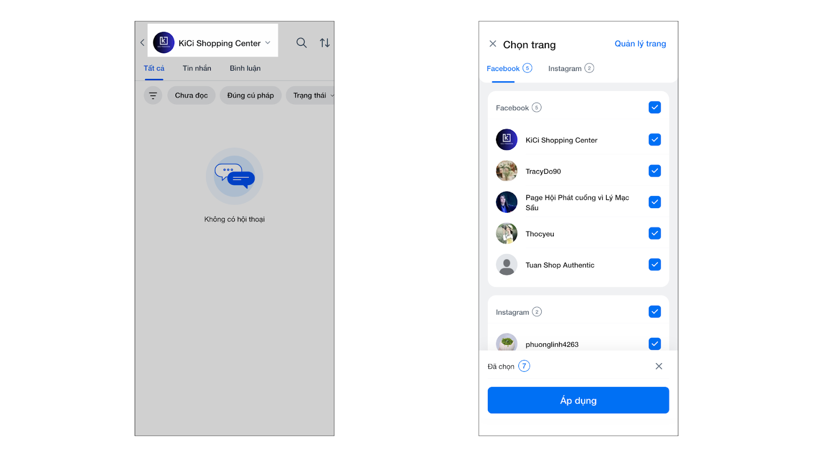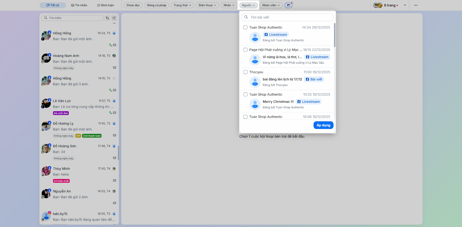 - Nhấn Áp dụng. Giao diện sẽ hiển thị hội thoại từ tất cả các kênh đã chọn.