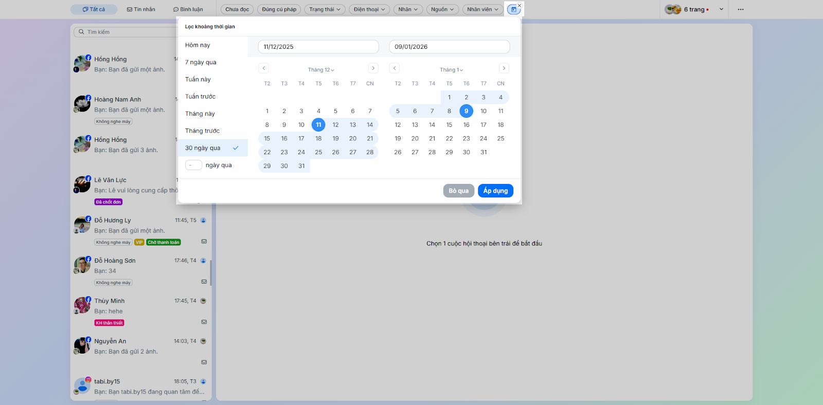 - Thời gian: Lọc theo thời gian của tin nhắn cuối cùng (Hôm nay, 7 ngày qua, Tuần này, Tuần trước, Tháng này, Tháng trước, 30 ngày qua,…).