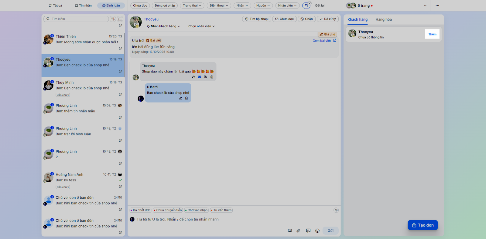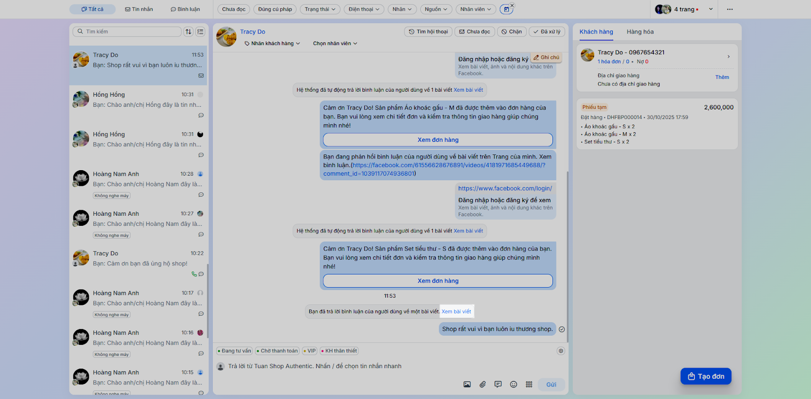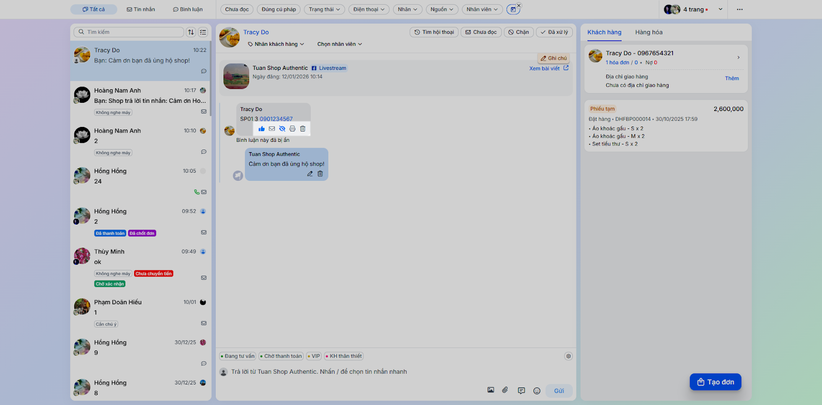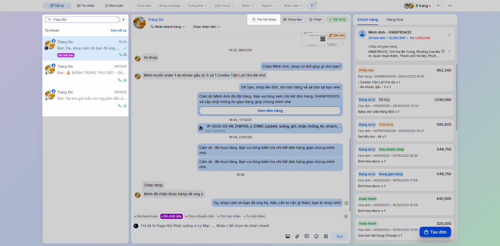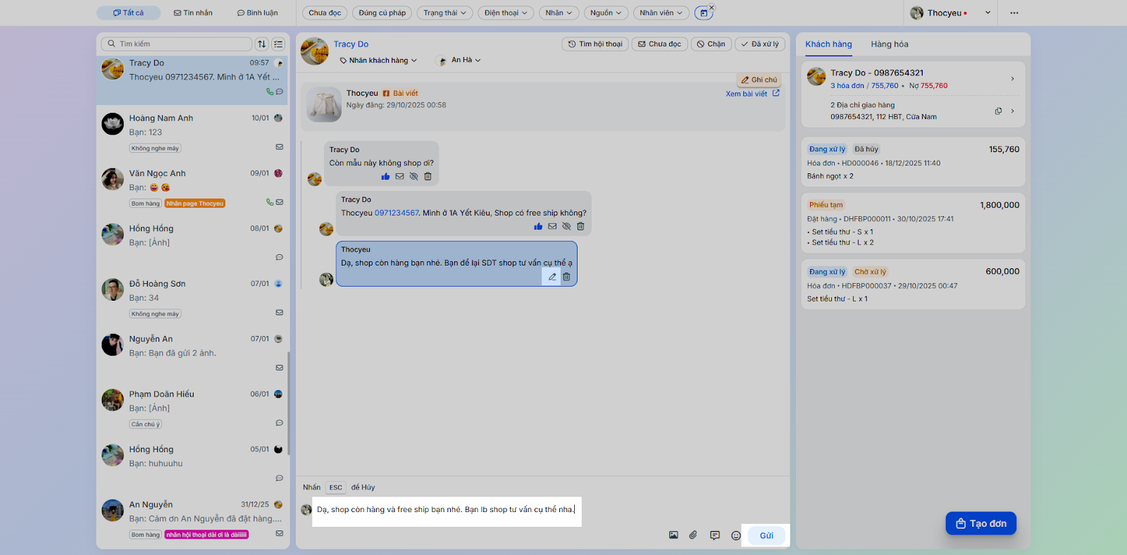- Tình huống: Thực hiện các tác vụ phản hồi và chăm sóc khách hàng trực tiếp trong chi tiết hội thoại.