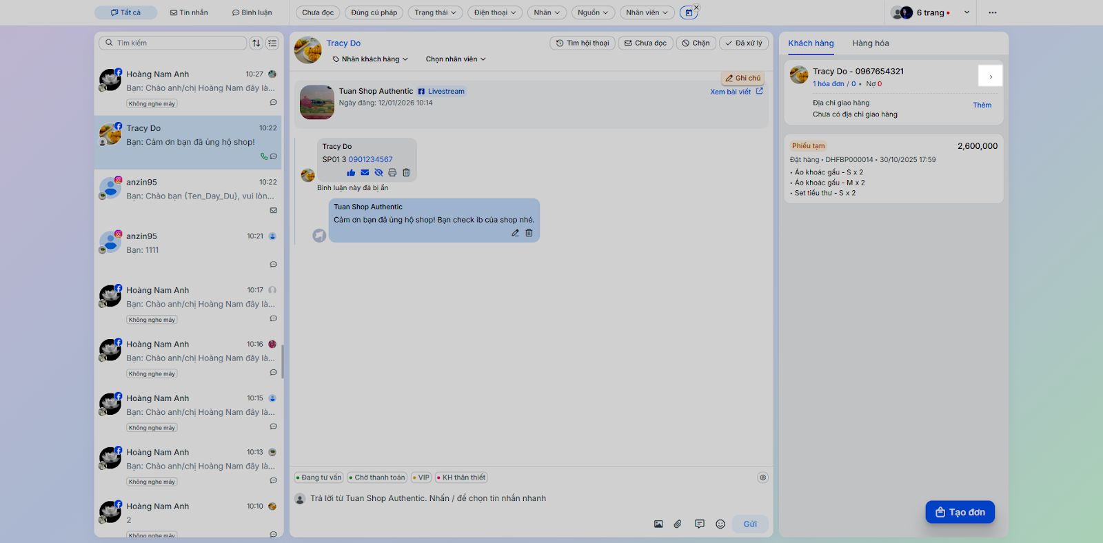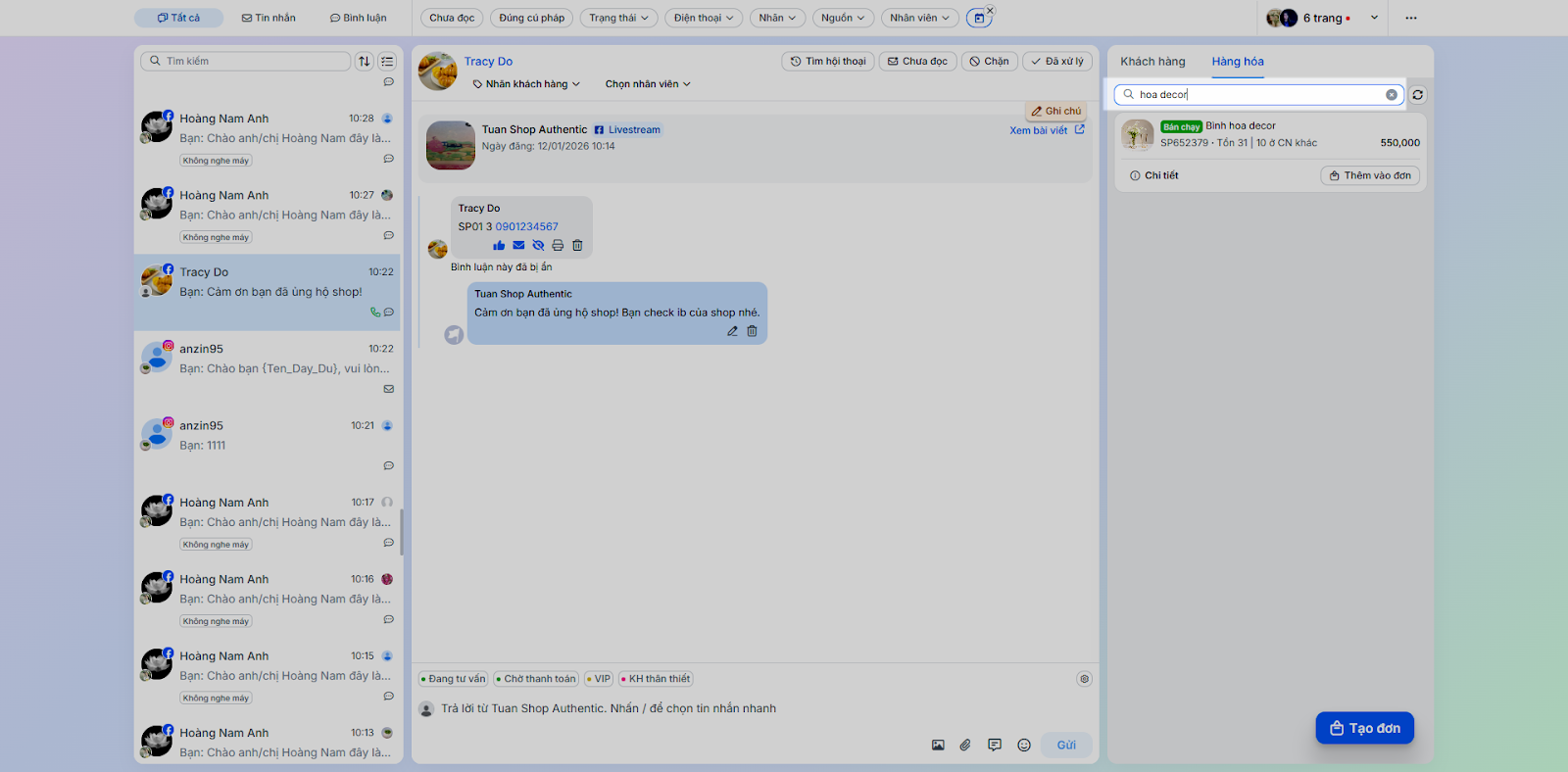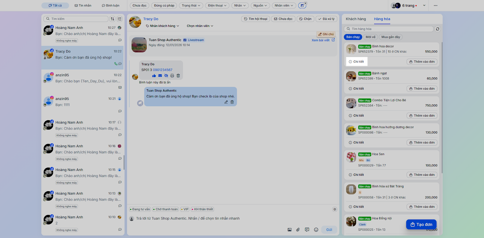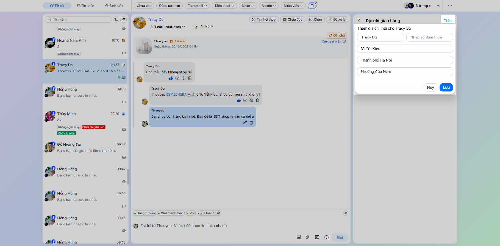 - Tình huống: Thực hiện các tác vụ phản hồi và chăm sóc khách hàng trực tiếp trong chi tiết hội thoại.