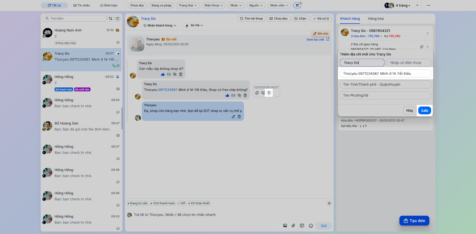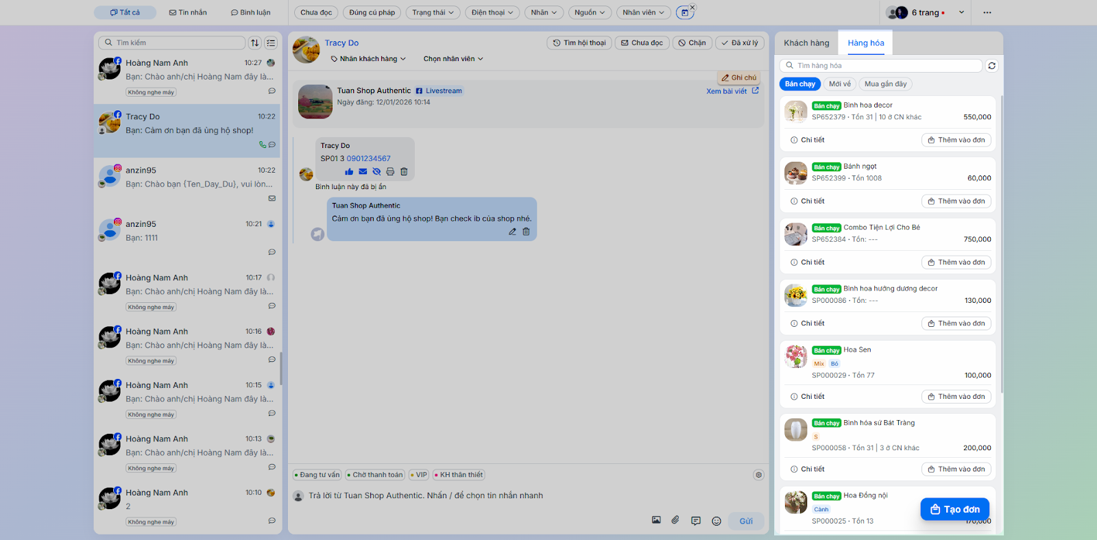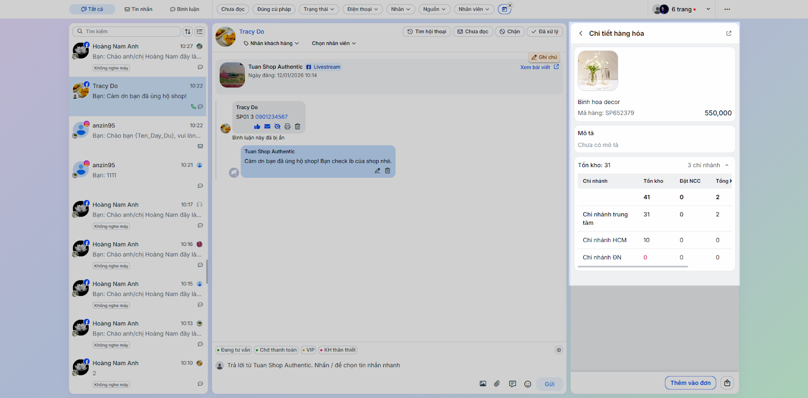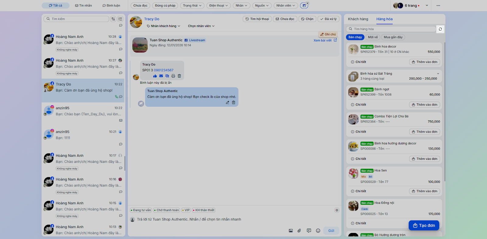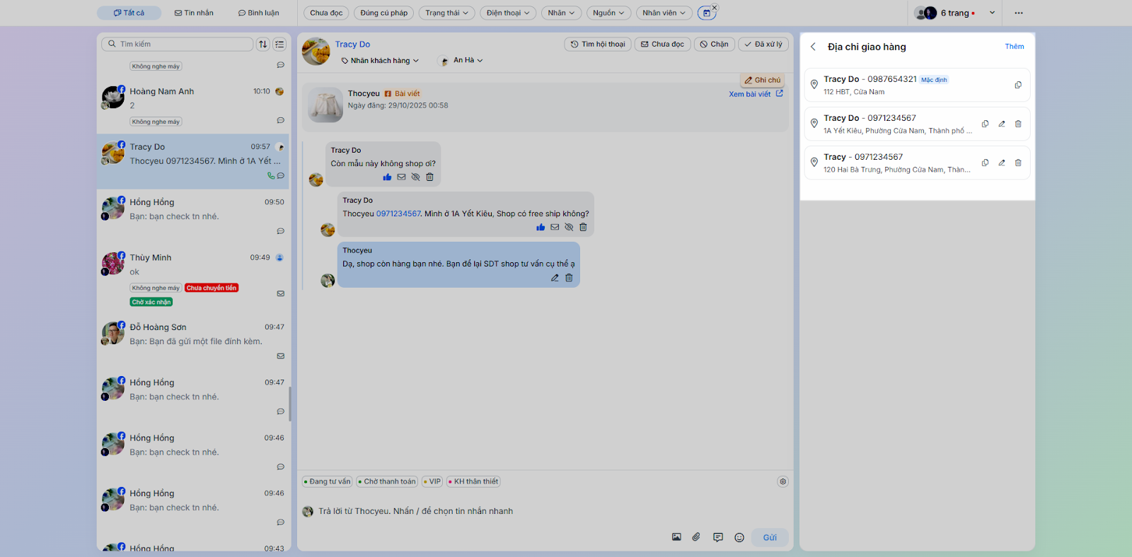 - Tình huống: Thực hiện các tác vụ phản hồi và chăm sóc khách hàng trực tiếp trong chi tiết hội thoại.
