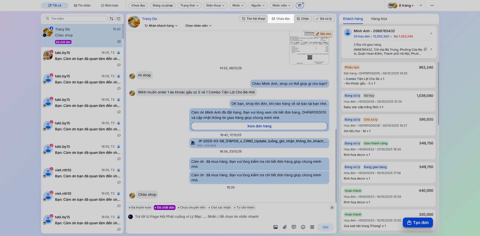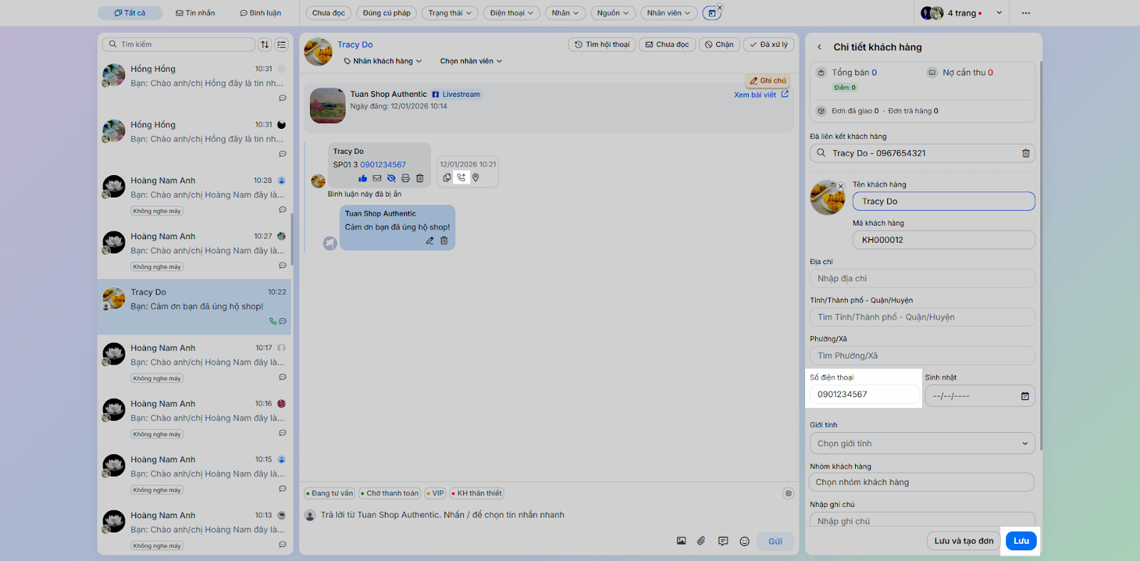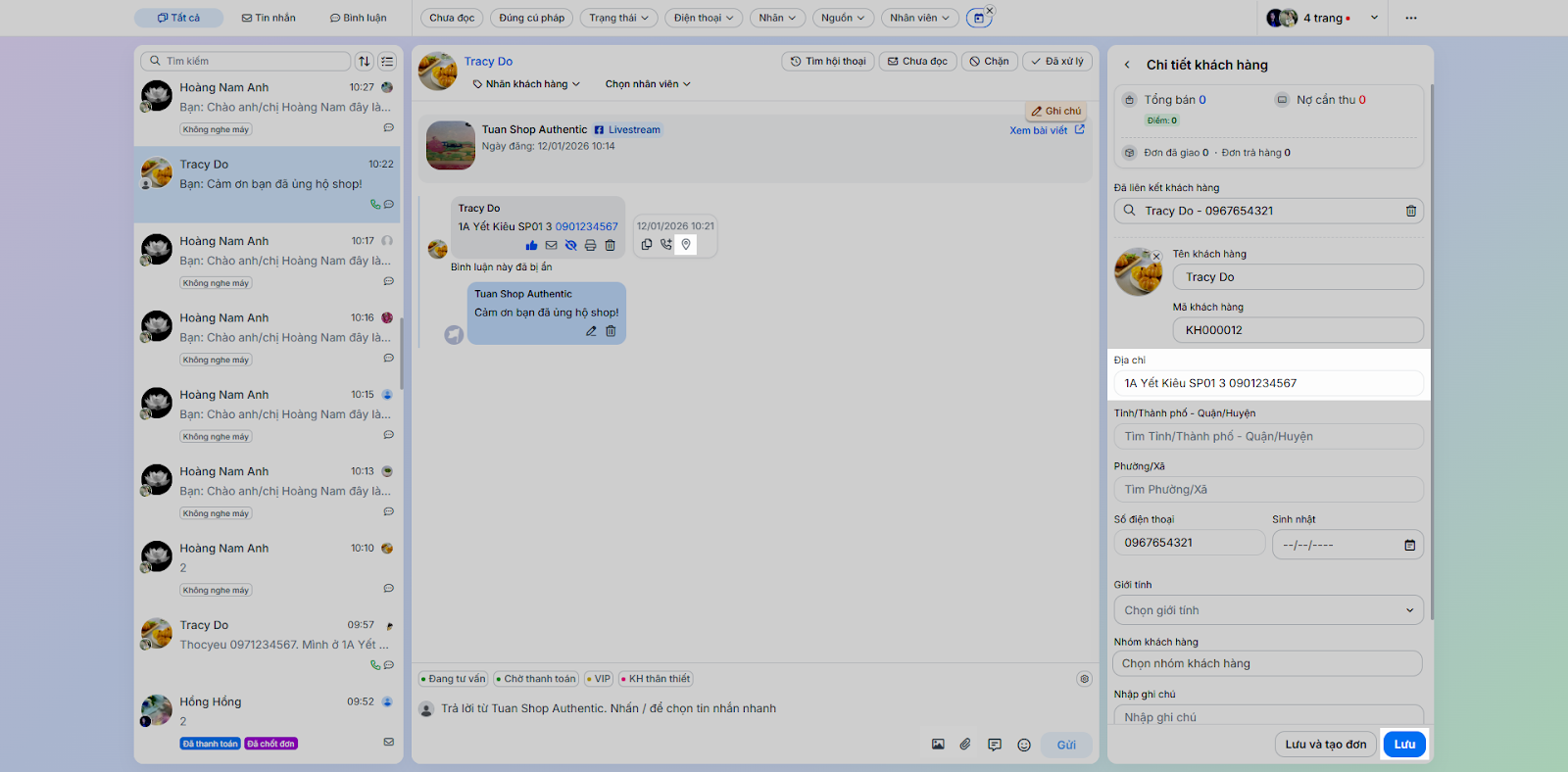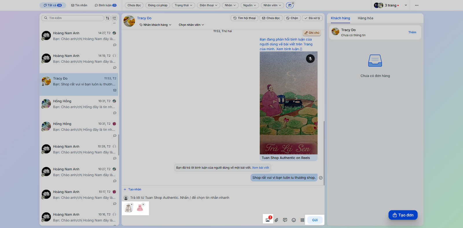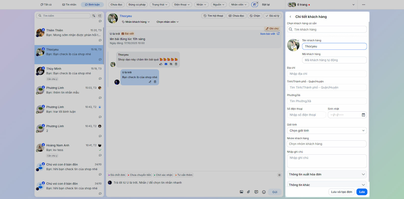 - Tình huống: Thực hiện các tác vụ phản hồi và chăm sóc khách hàng trực tiếp trong chi tiết hội thoại.