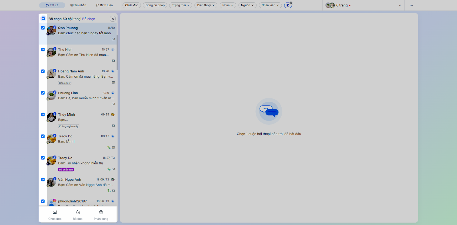 → tích chọn các hội thoại để đánh dấu Chưa đọc, Đã đọc hoặc Phân công cho nhân viên.