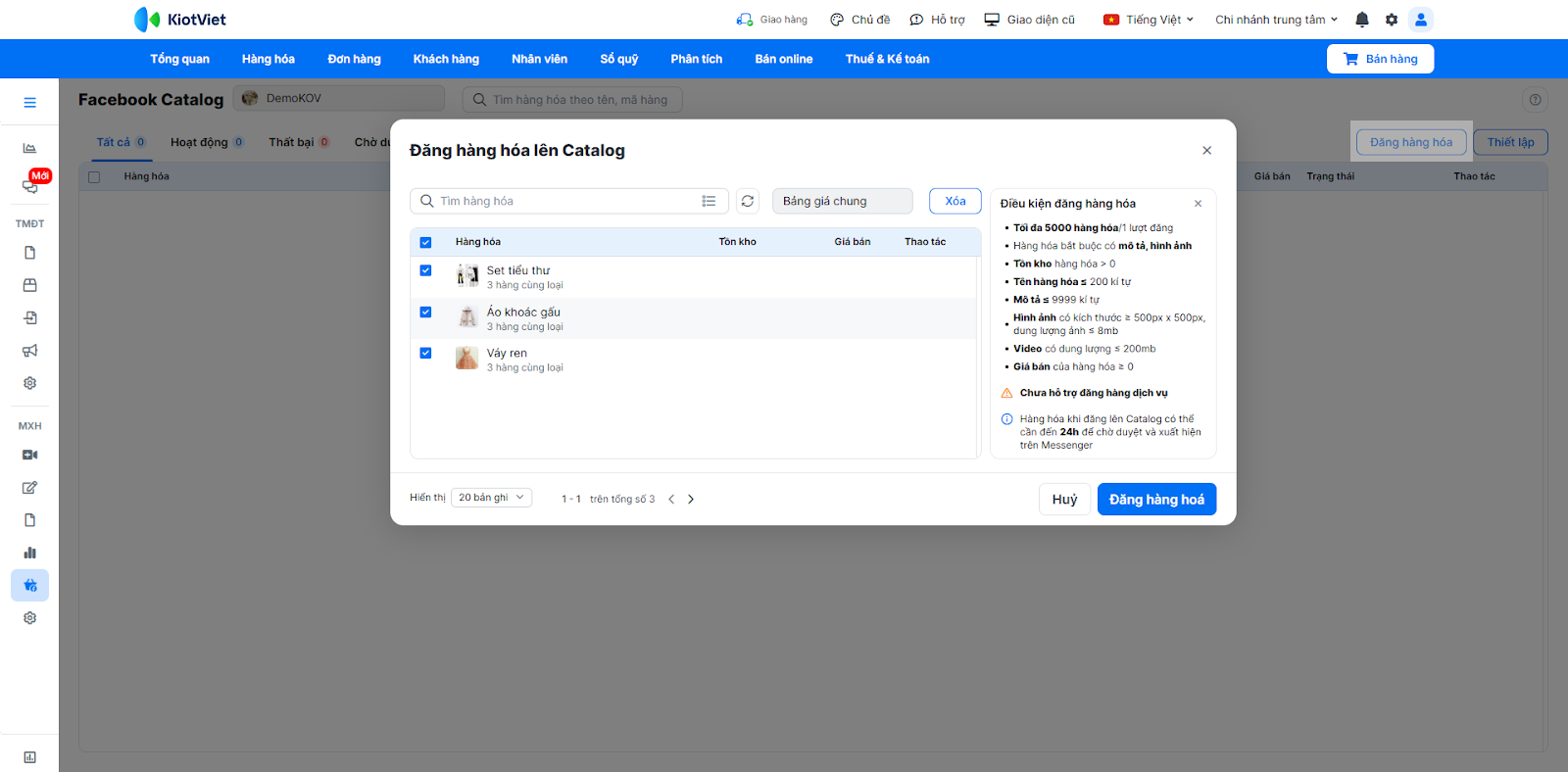 - Hệ thống chuyển đến màn hình Facebook Catalog. Bạn nhấn Đăng hàng hóa → tìm kiếm và chọn hàng hóa, danh mục hàng hóa → nhấn Đăng hàng hóa.