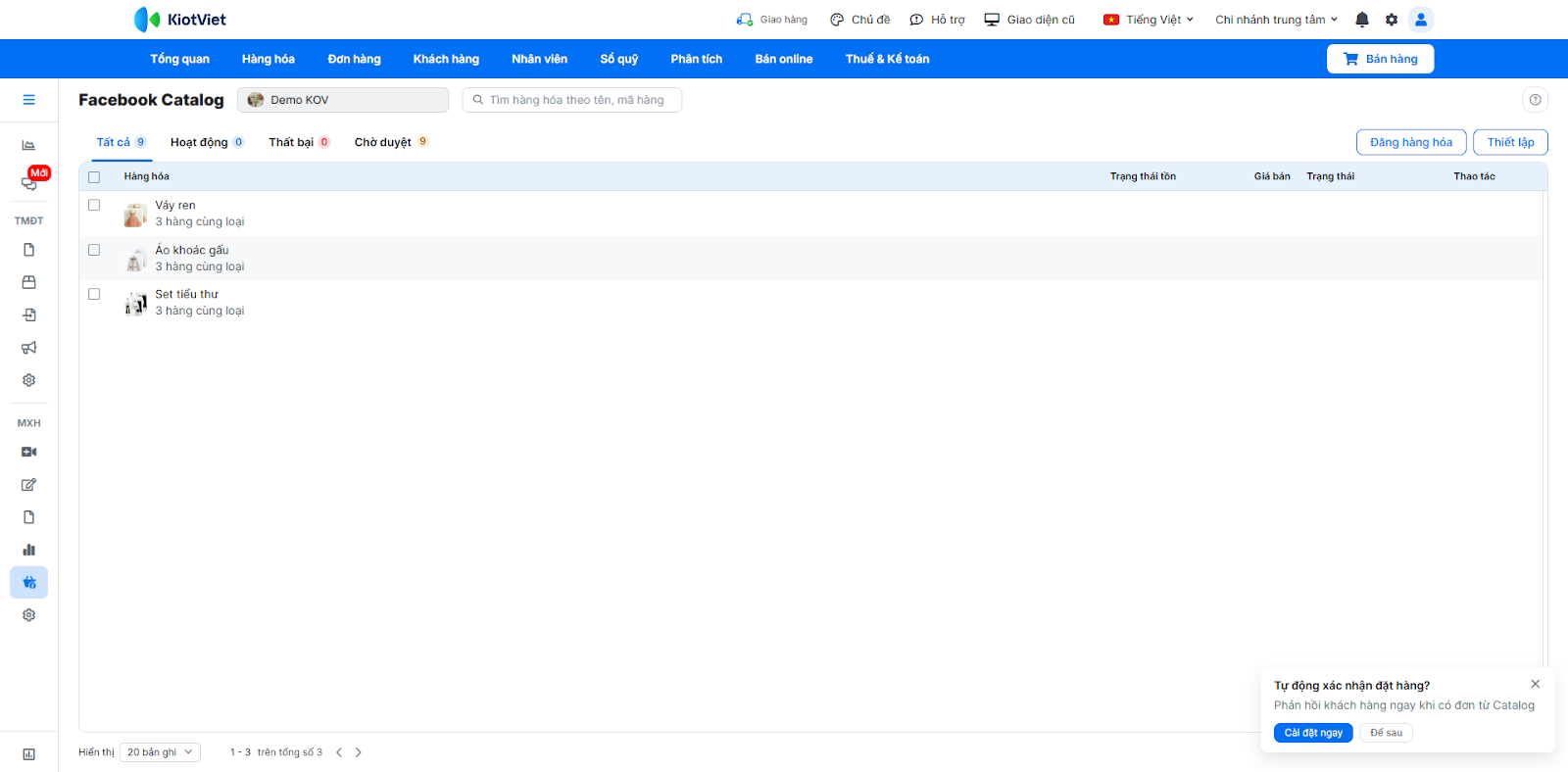 - Hàng hóa được đẩy lên Catalog và hiển thị với trạng thái Chờ duyệt.