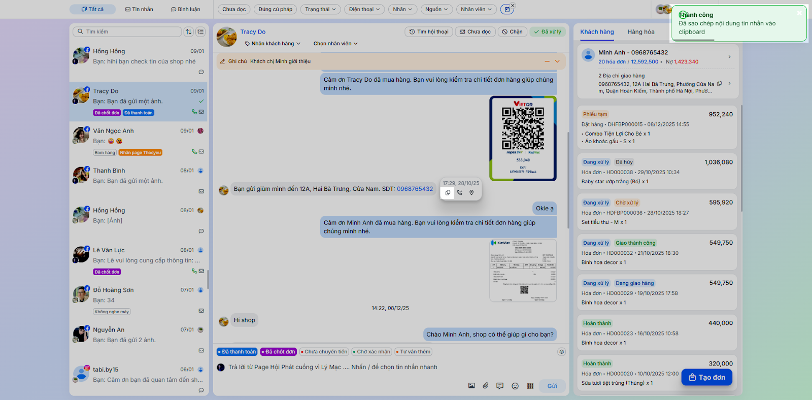 - Đối với tin nhắn của khách, bạn nhấn và giữ để Sao chép, Cập nhật SĐT hoặc Lưu địa chỉ.