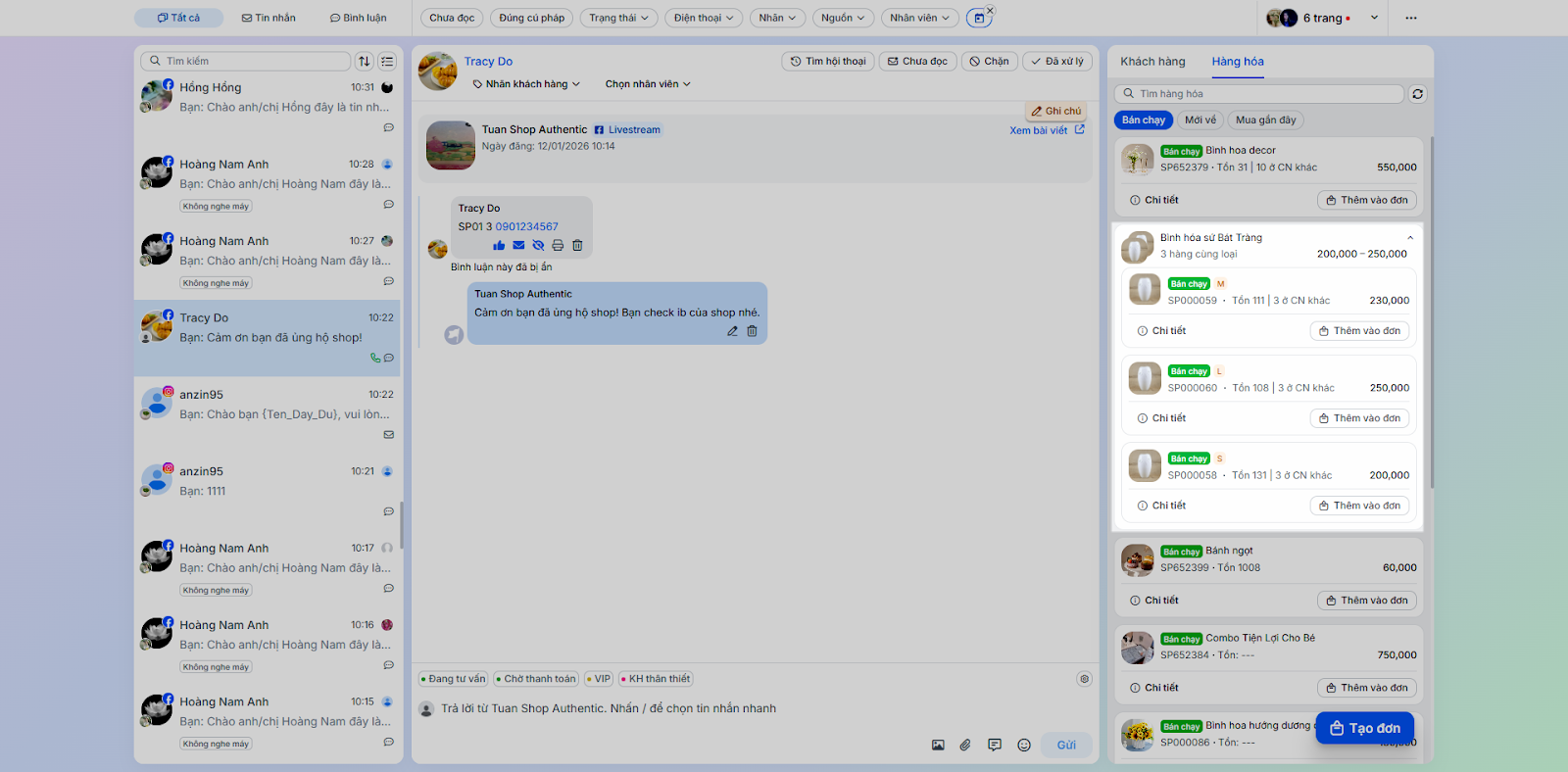 - Nâng cao hiệu quả bán hàng: Phân công hội thoại, gắn nhãn khách hàng, tạo đơn hàng trực tiếp từ khung chat.