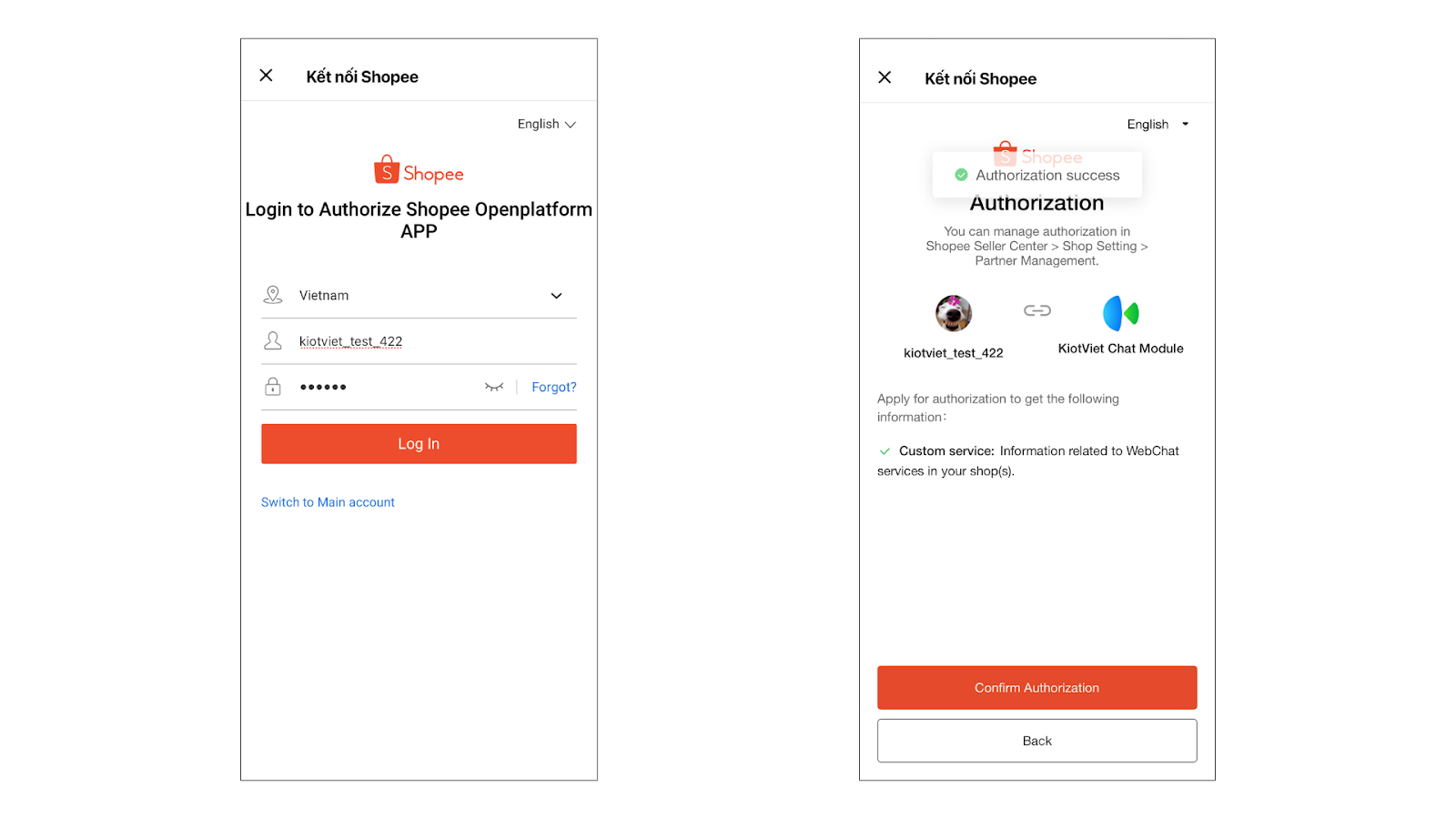 - Hệ thống sẽ chuyển đến trang đăng nhập của Shopee. Bạn đăng nhập vào tài khoản nhà bán và xác nhận đồng ý kết nối.