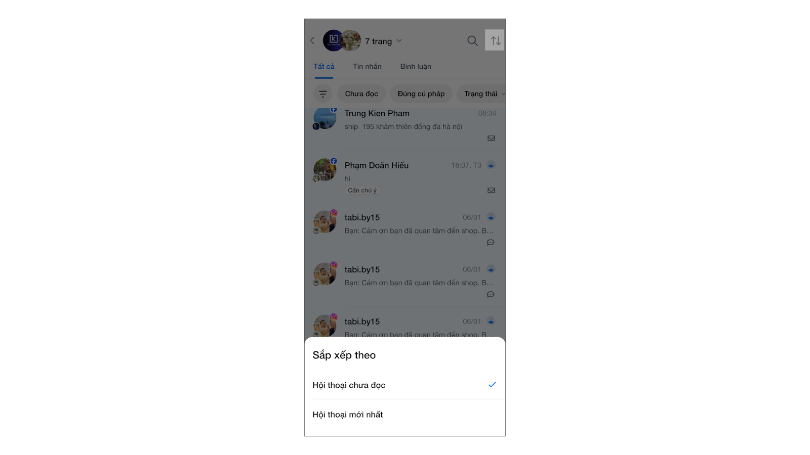 Bạn nhấn vào biểu tượng mũi tên 2 chiều → chọn cách hiển thị thứ tự các hội thoại theo trạng thái chưa đọc hoặc mới nhất.