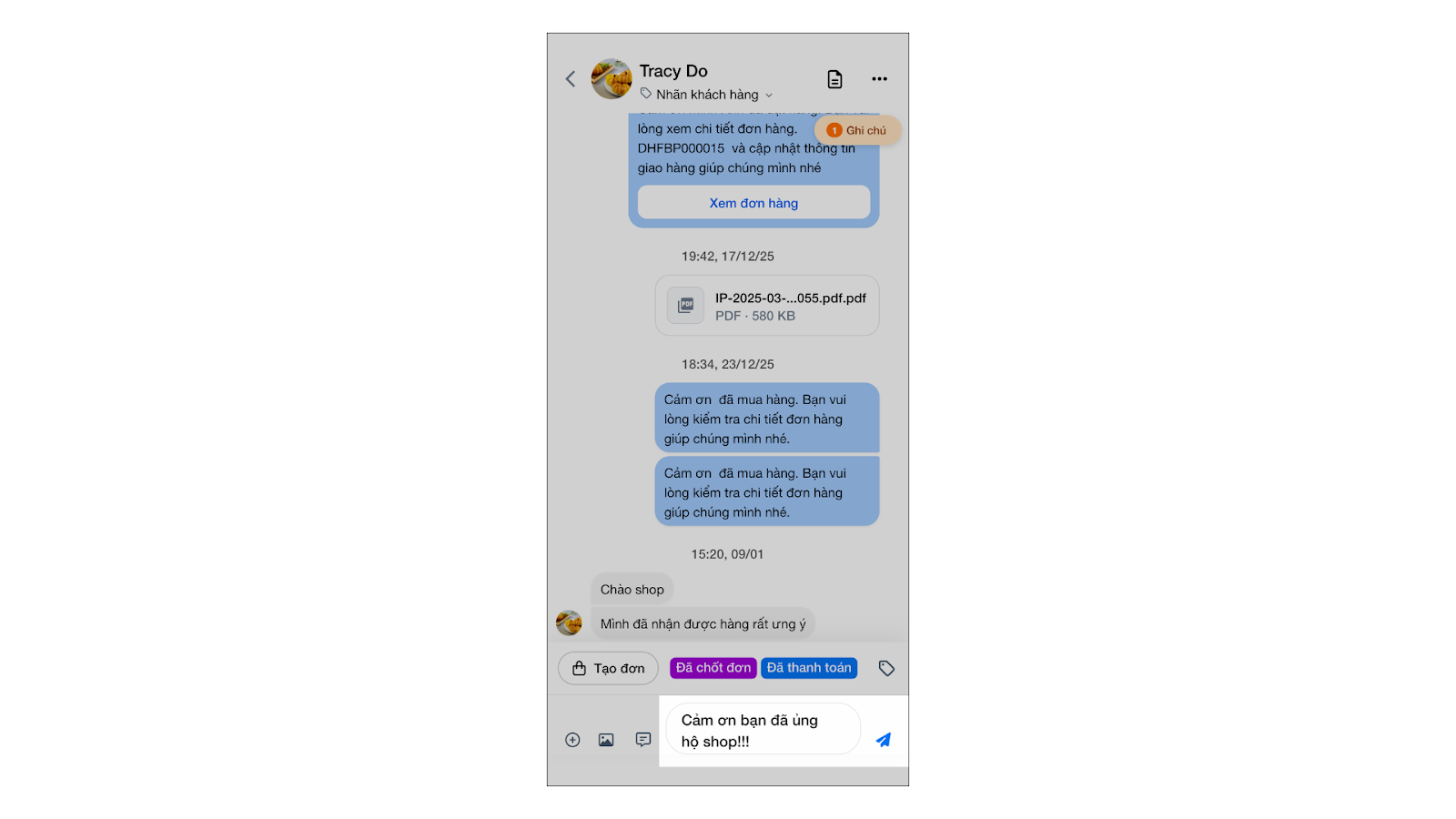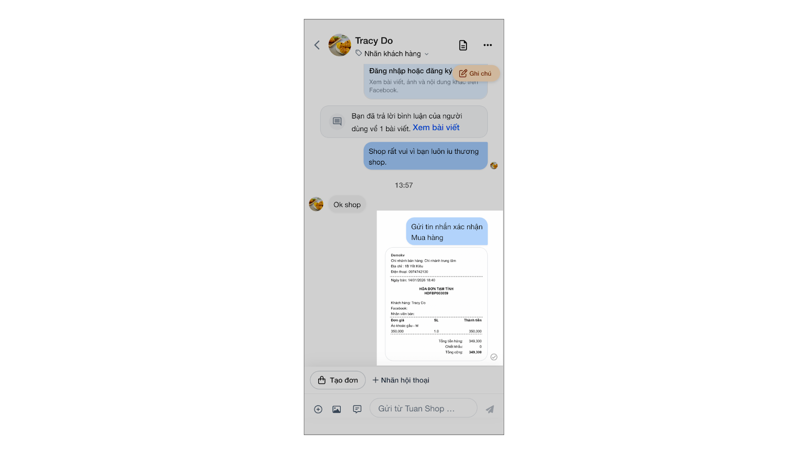 - Sau khi nhấn Hoàn thành để ghi nhận đơn hàng vào hệ thống → ứng dụng trở lại màn hình hội thoại kèm thông báo tạo đơn thành công (có thể gửi chi tiết đơn cho khách).