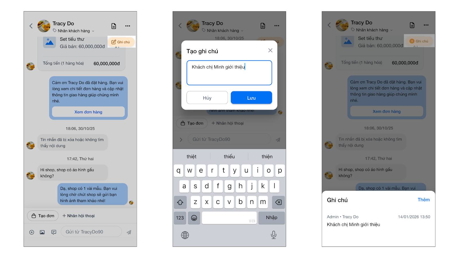 - Ghi chú: Nhấn Ghi chú → nhập nội dung → nhấn Enter để lưu lại lưu ý cho hội thoại (chỉ hiển thị nội bộ).