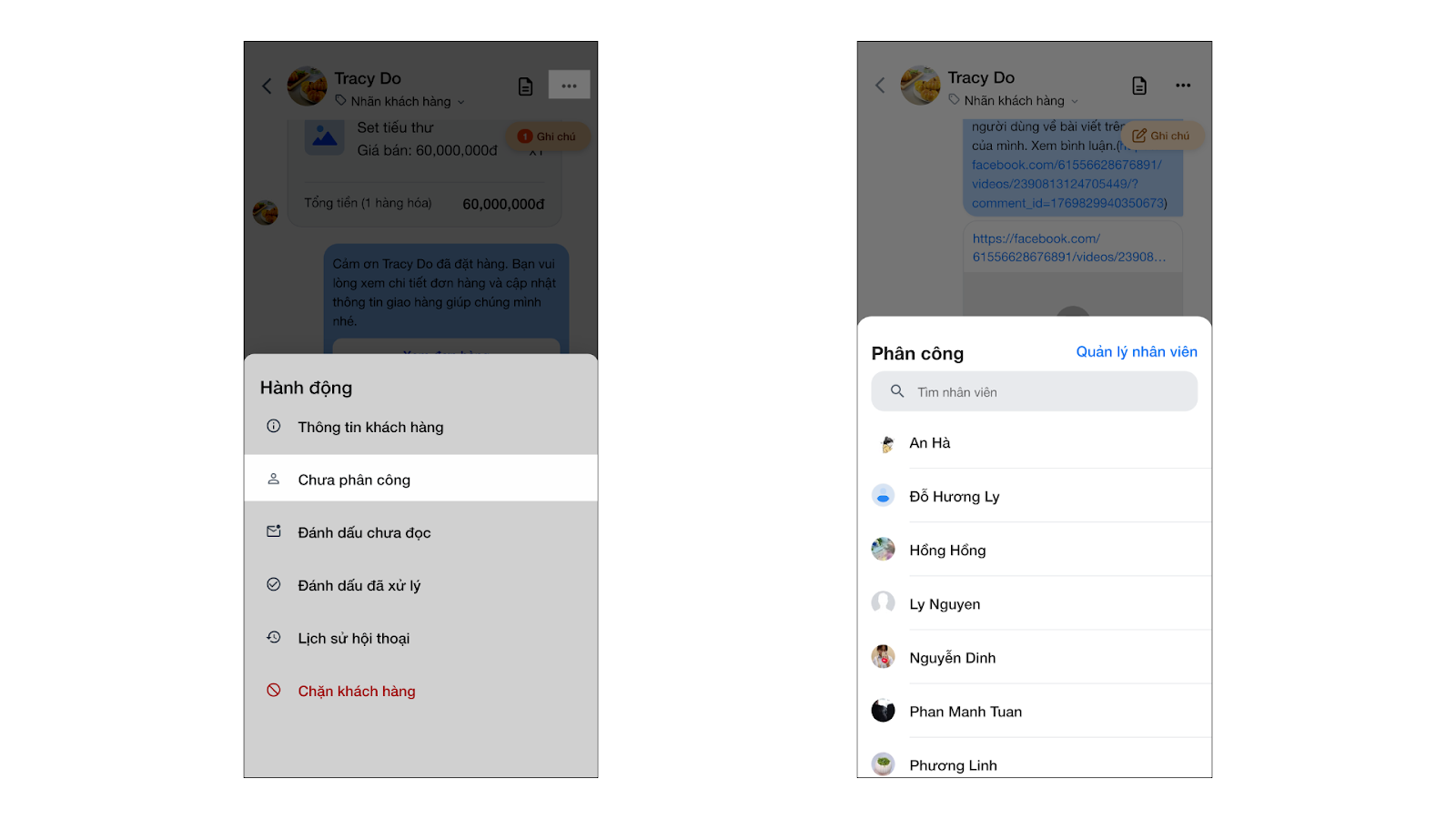 - Phân công hội thoại: Trong một hội thoại, nhấn Chọn nhân viên và chọn tên nhân viên cụ thể bạn muốn giao nhiệm vụ chăm sóc khách.