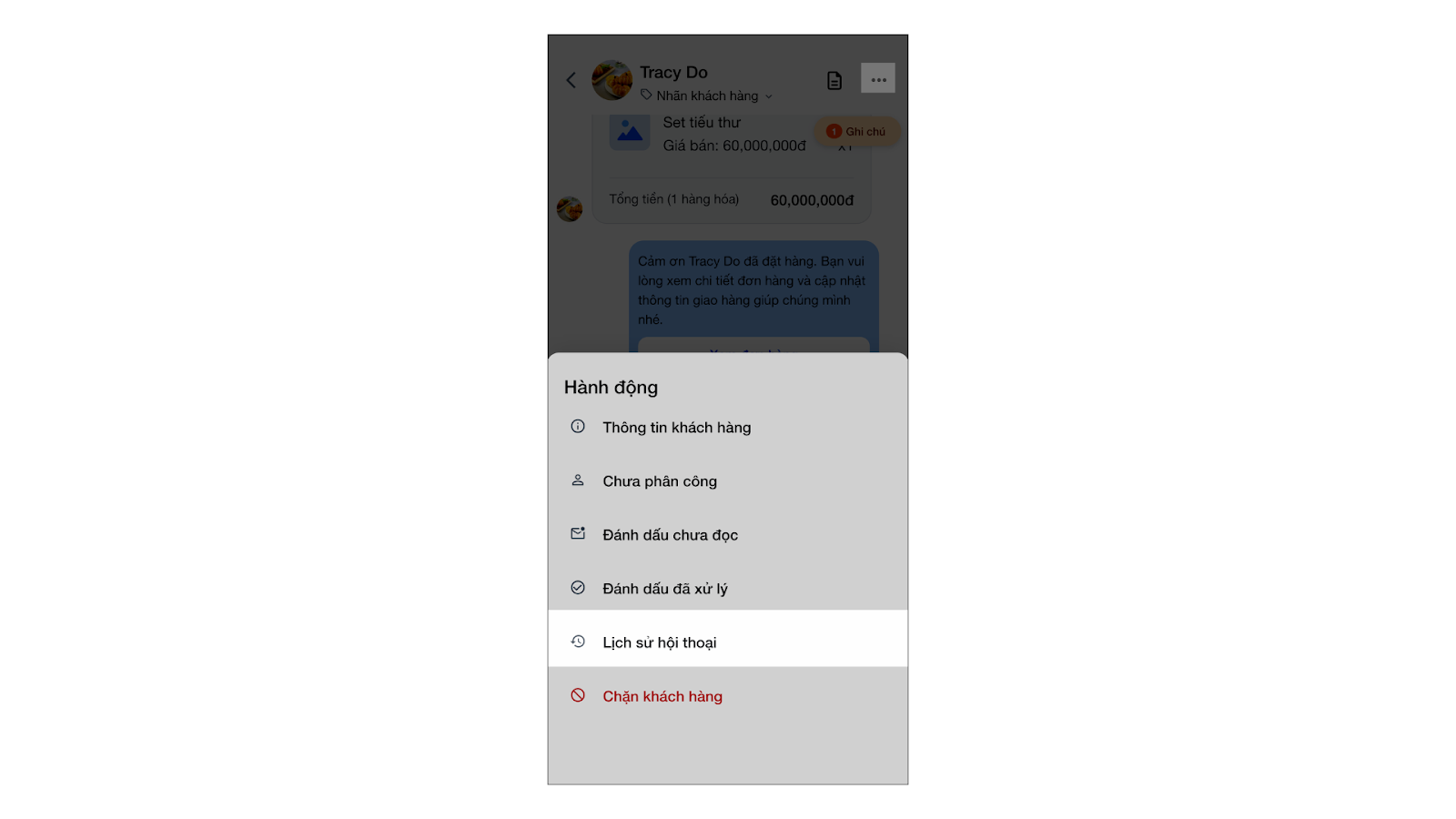 - Ghi chú: Nhấn Ghi chú để thêm lưu ý cho hội thoại (chỉ hiển thị nội bộ).