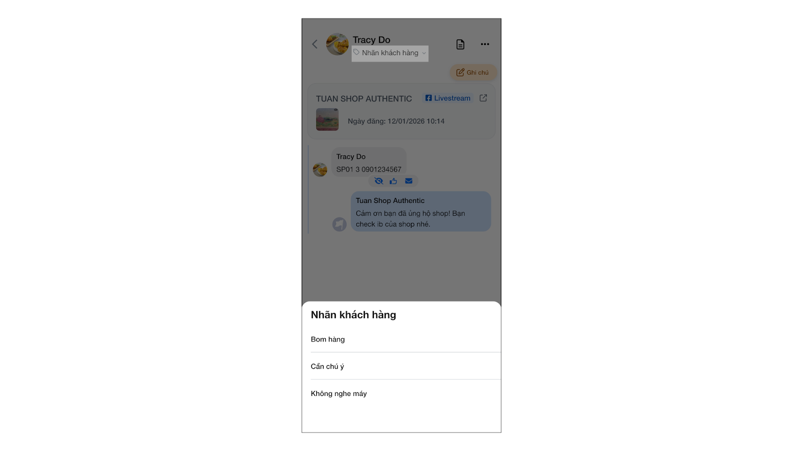 - Gắn nhãn khách hàng: Bạn nhấn vào Nhãn khách hàng → chọn 1 trong các nhãn: Bom hàng, Không nghe máy, Cần chú ý.