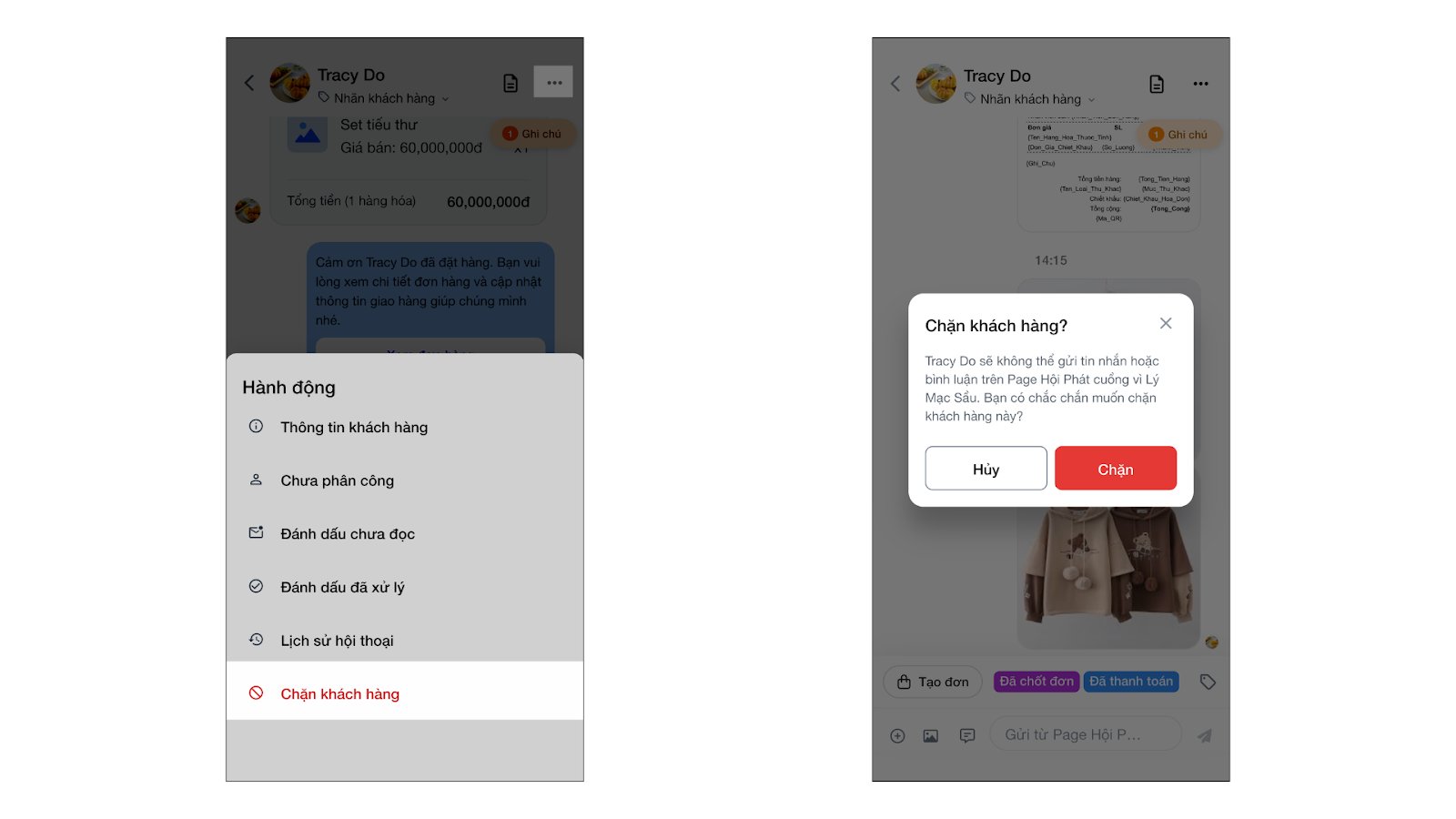 Để bỏ chặn khách bạn thao tác tương tự chọn Bỏ chặn khách hàng → xác nhận Bỏ chặn.