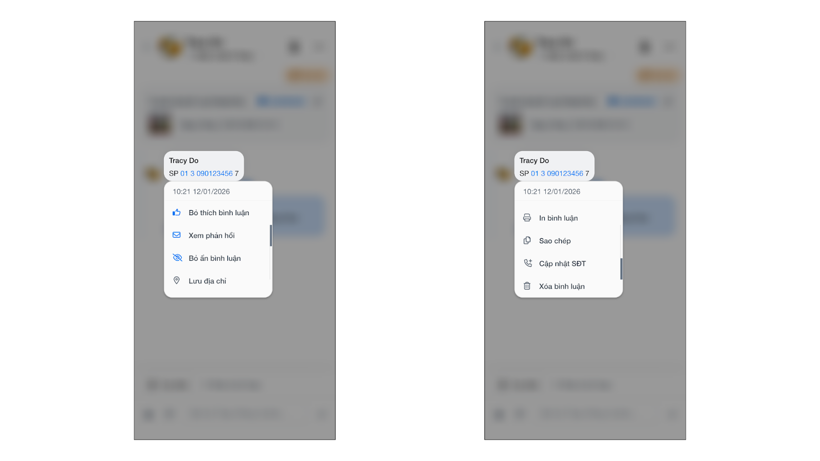 - Bạn nhấn vào bình luận có chứa số điện thoại → nhấn vào biểu tượng tương ứng để sao chép, thêm số điện thoại vào thông tin khách.