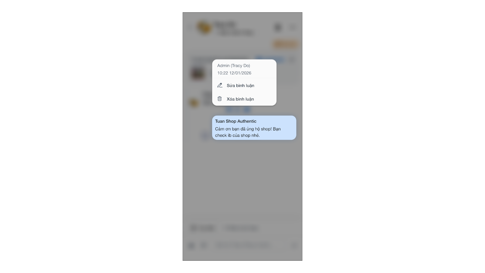 - Chỉnh sửa bình luận: Nhấn giữ nội dung bình luận của shop đã trả lời khách để sửa/ xóa.