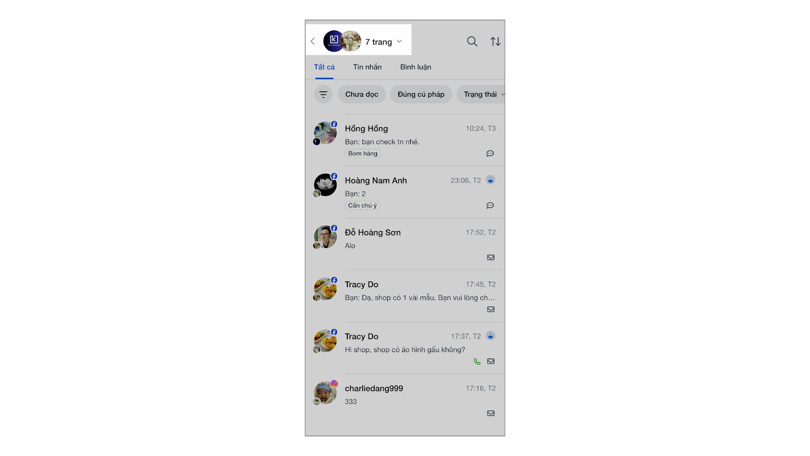- Khi chọn nhiều kênh → trên hội thoại sẽ hiển thị logo của nên tảng (Facebook, Instagram hay Shopee) và avatar của trang tương ứng để bạn dễ dàng phân biệt nguồn khách.