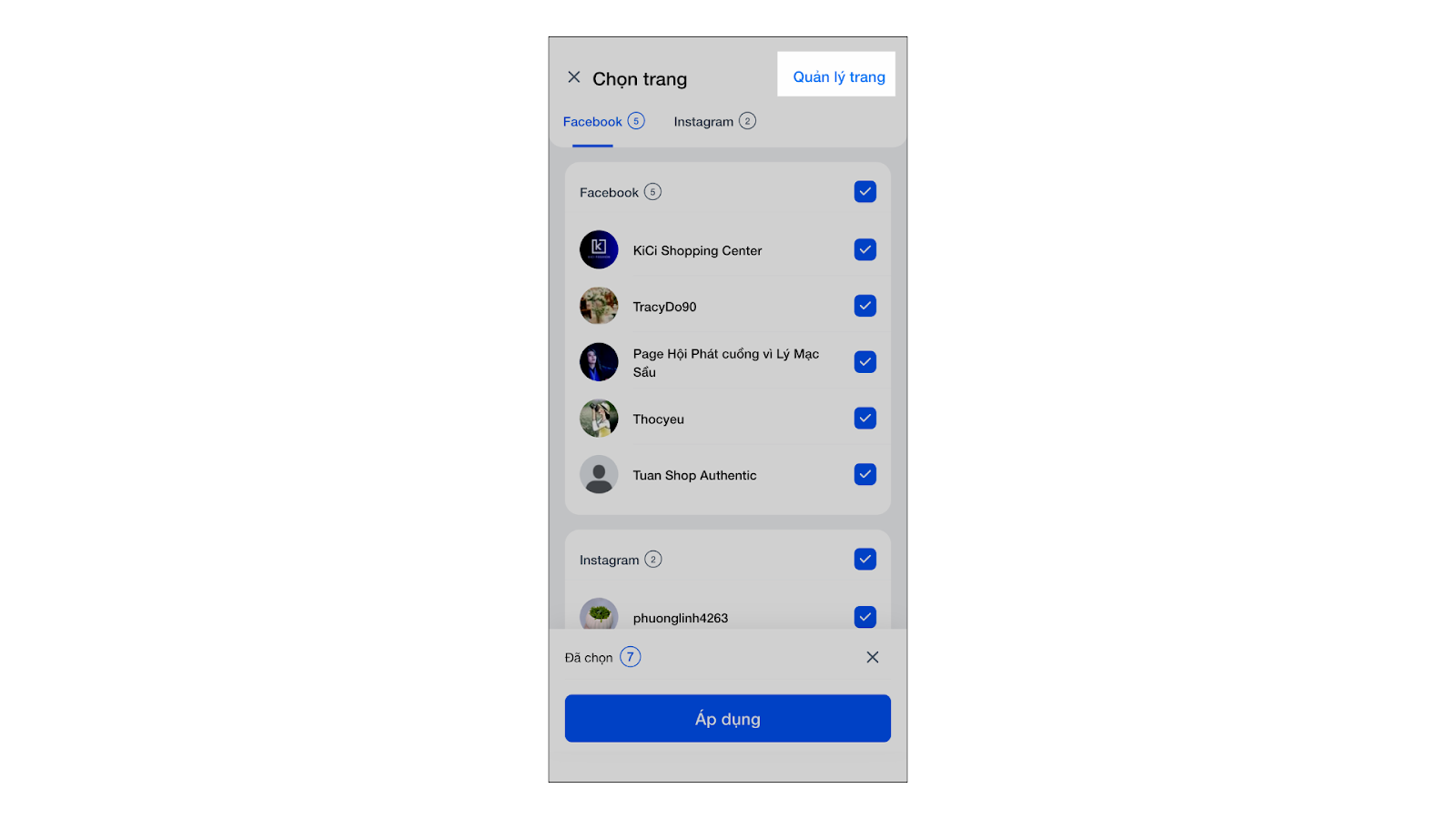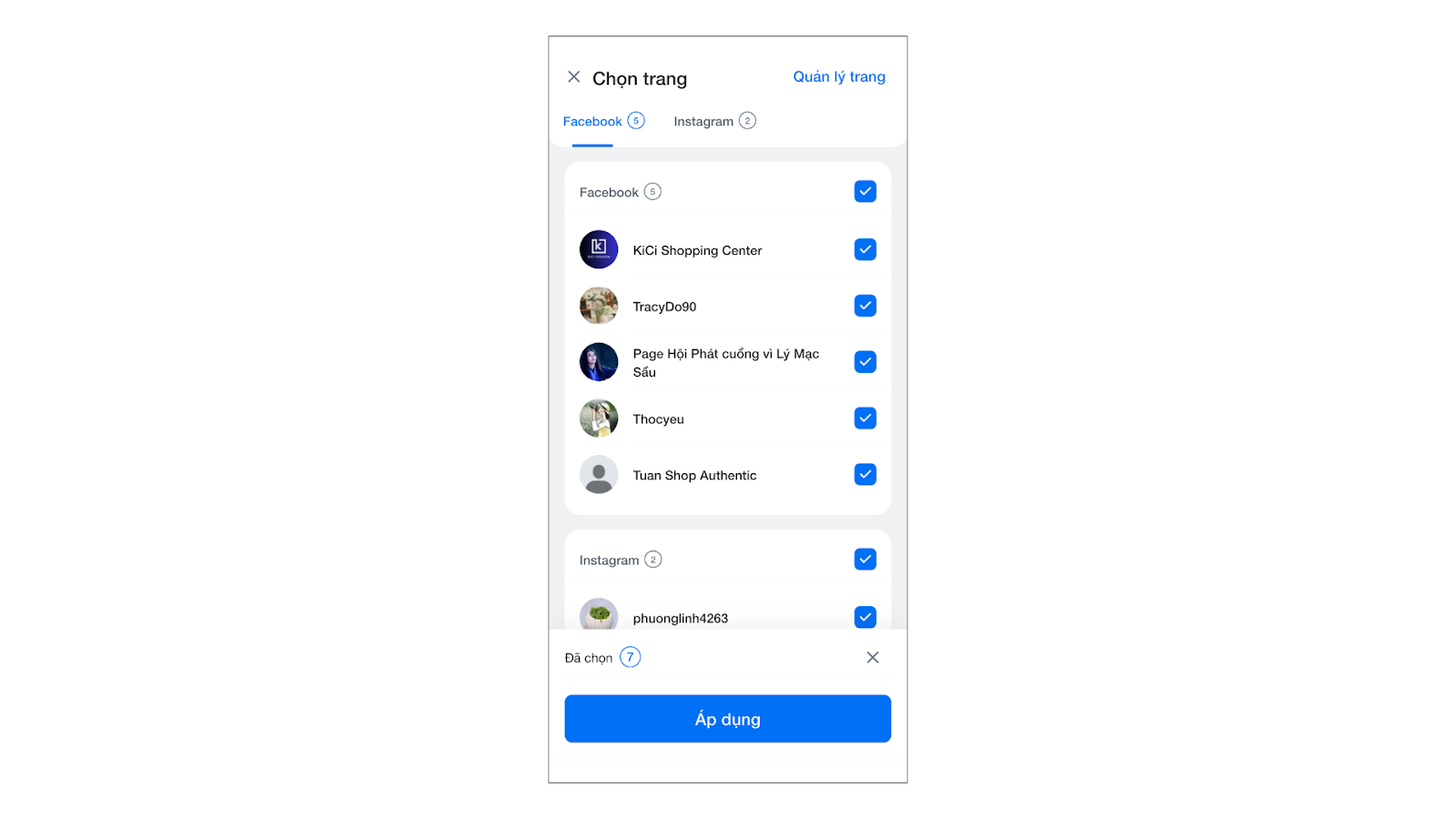 - Tích chọn tất cả các trang hoặc gian hàng bạn muốn quản lý chung (tối đa 50 trang).