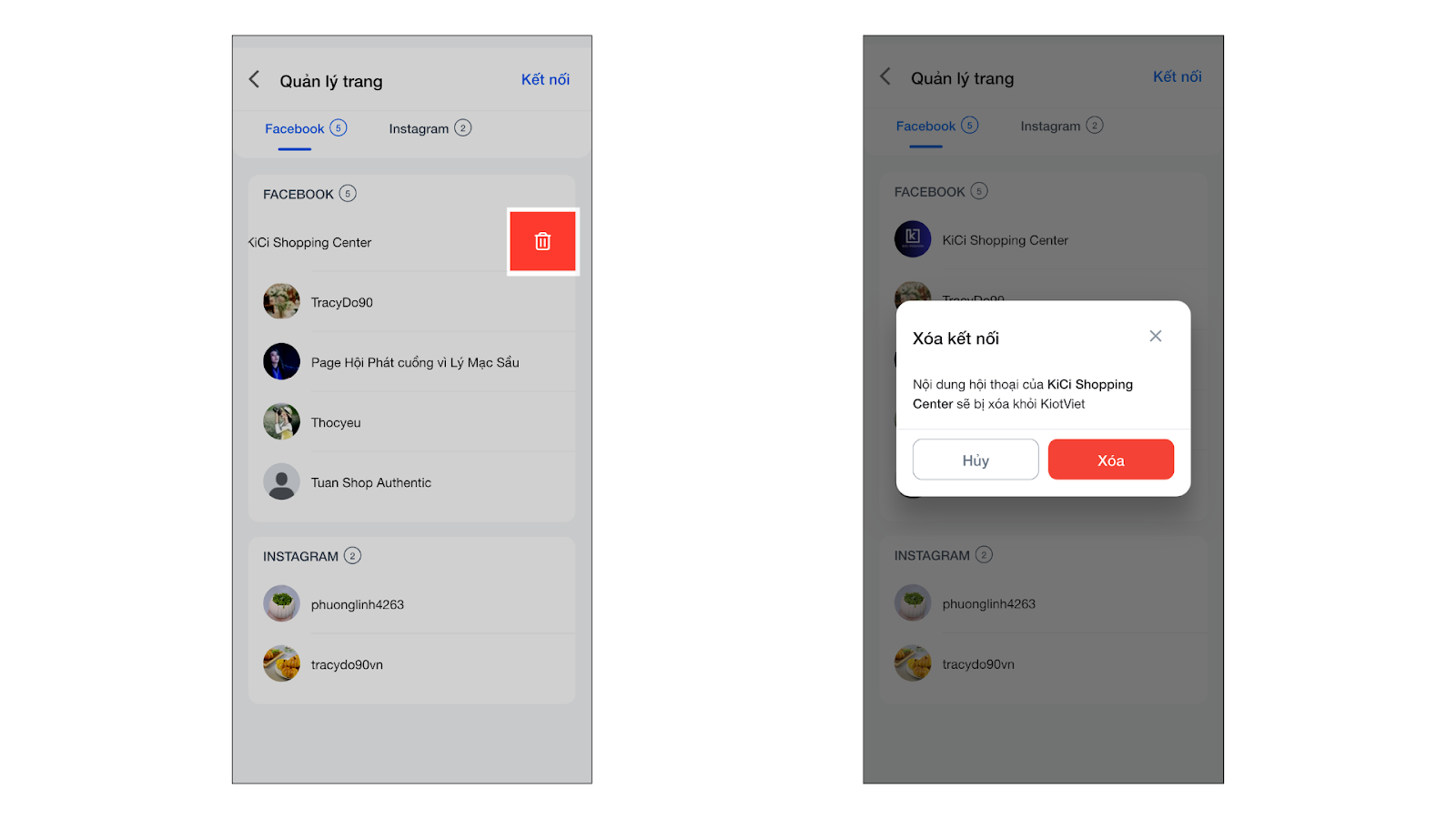 - Vuốt sang trái trên trang/shop → chọn biểu tượng thùng rác → xác nhấn Xóa kết nối.