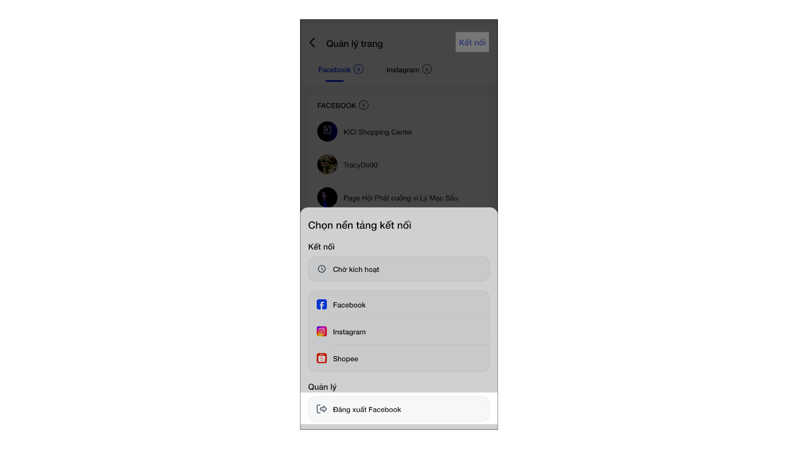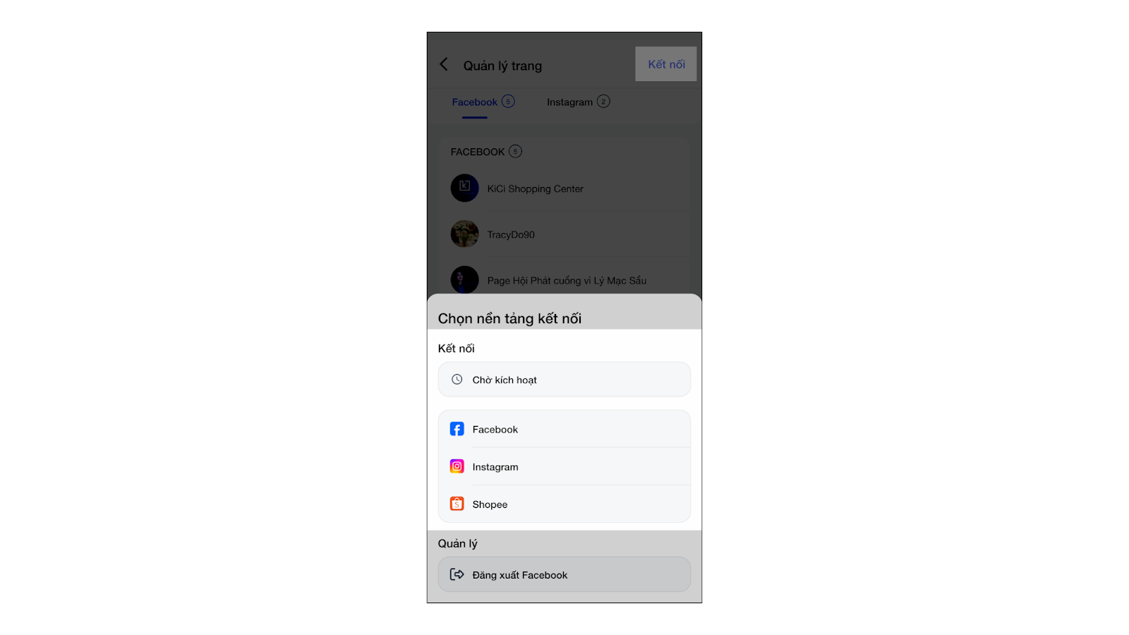 - Để thêm trang, shop → bạn nhấn Kết nối → chọn nền tảng cần kết nối hoặc nhấn Chờ kích hoạt để thêm các trang được tài khoản facebook của shop quản lý nhưng chưa được kết nối.