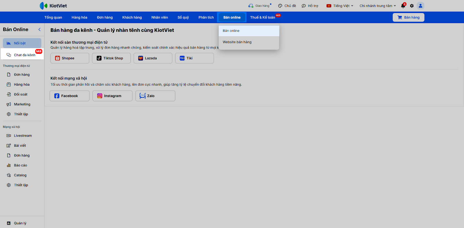 - Tại màn hình Quản lý, từ menu Bán online → Bán online, bạn chọn Chat đa kênh.