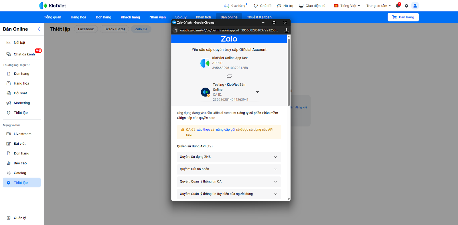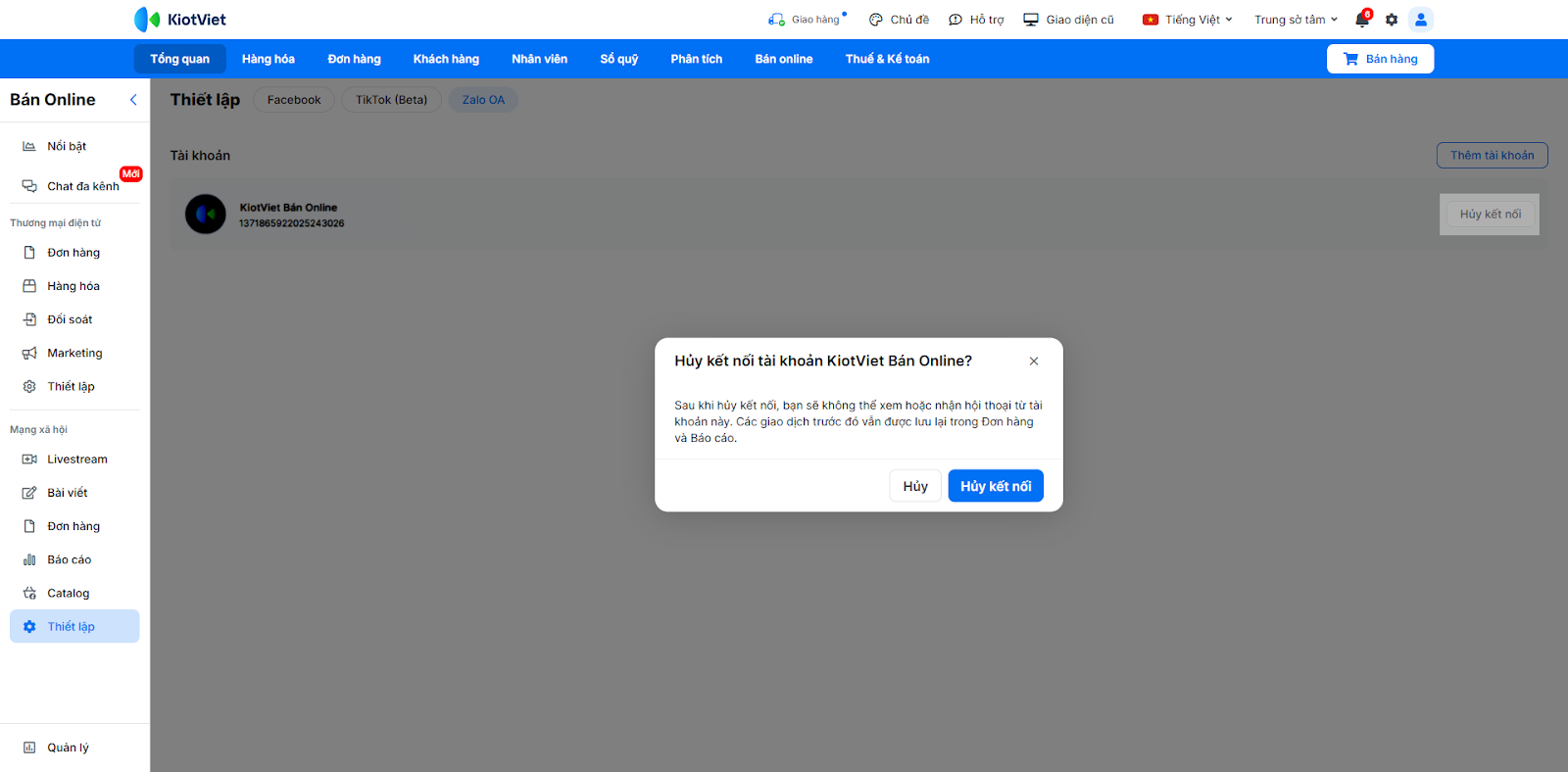 - Tình huống: Bạn cần kết nối tài khoản Facebook/Instagram/Shopee/Zalo OA với KiotViet để phần mềm có thể truy cập vào hội thoại trên các nền tảng này.