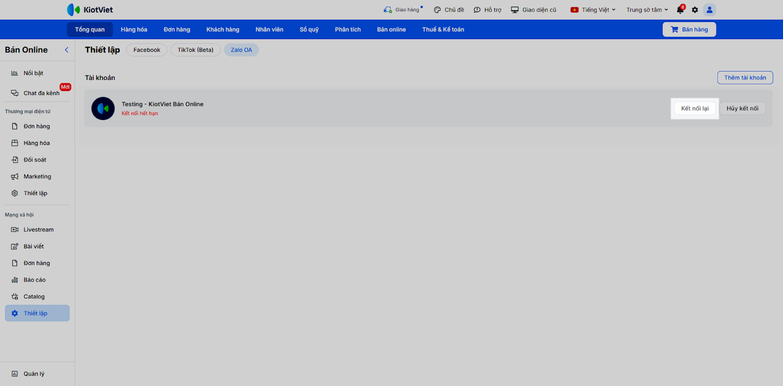 - Sau khi bạn nhấn vào biểu tượng kênh bán Zalo OA → hệ thống chuyển đến màn hình Thiết lập → Zalo OA (trong khối Mạng xã hội) → bạn nhấn Kết nối.