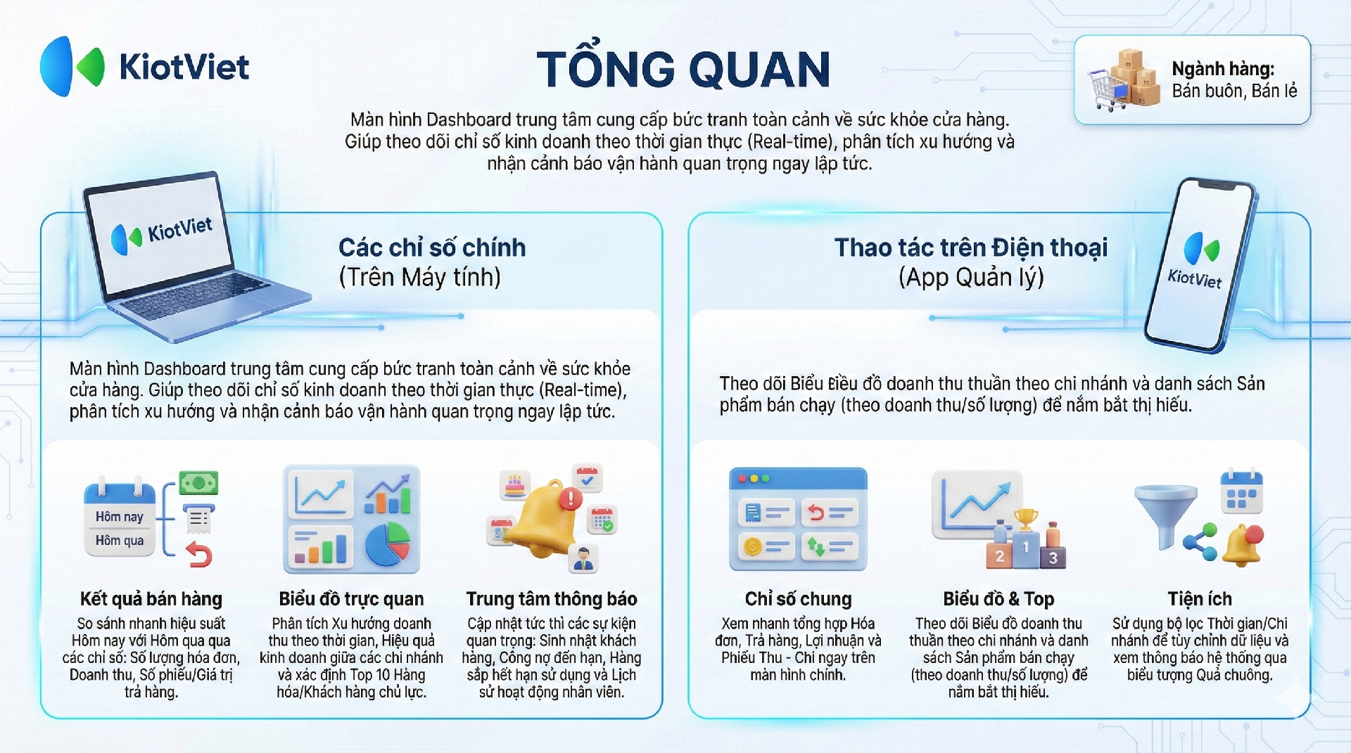 Màn hình Tổng quan là trung tâm điều hành của cửa hàng trên KiotViet, cung cấp một bức tranh toàn cảnh về hoạt động kinh doanh. Việc theo dõi thường xuyên màn hình này sẽ mang lại những lợi ích thiết thực: