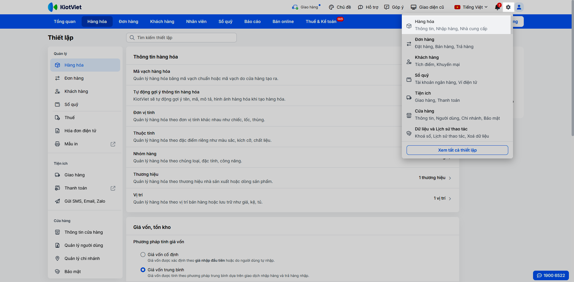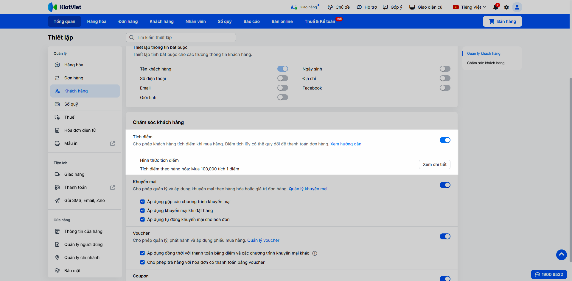 - Tình huống: Trước khi bắt đầu nhập và bán sản phẩm, bạn cần kích hoạt các tính năng cần thiết như quản lý Lô – Hạn sử dụng và chương trình Tích điểm cho khách hàng.