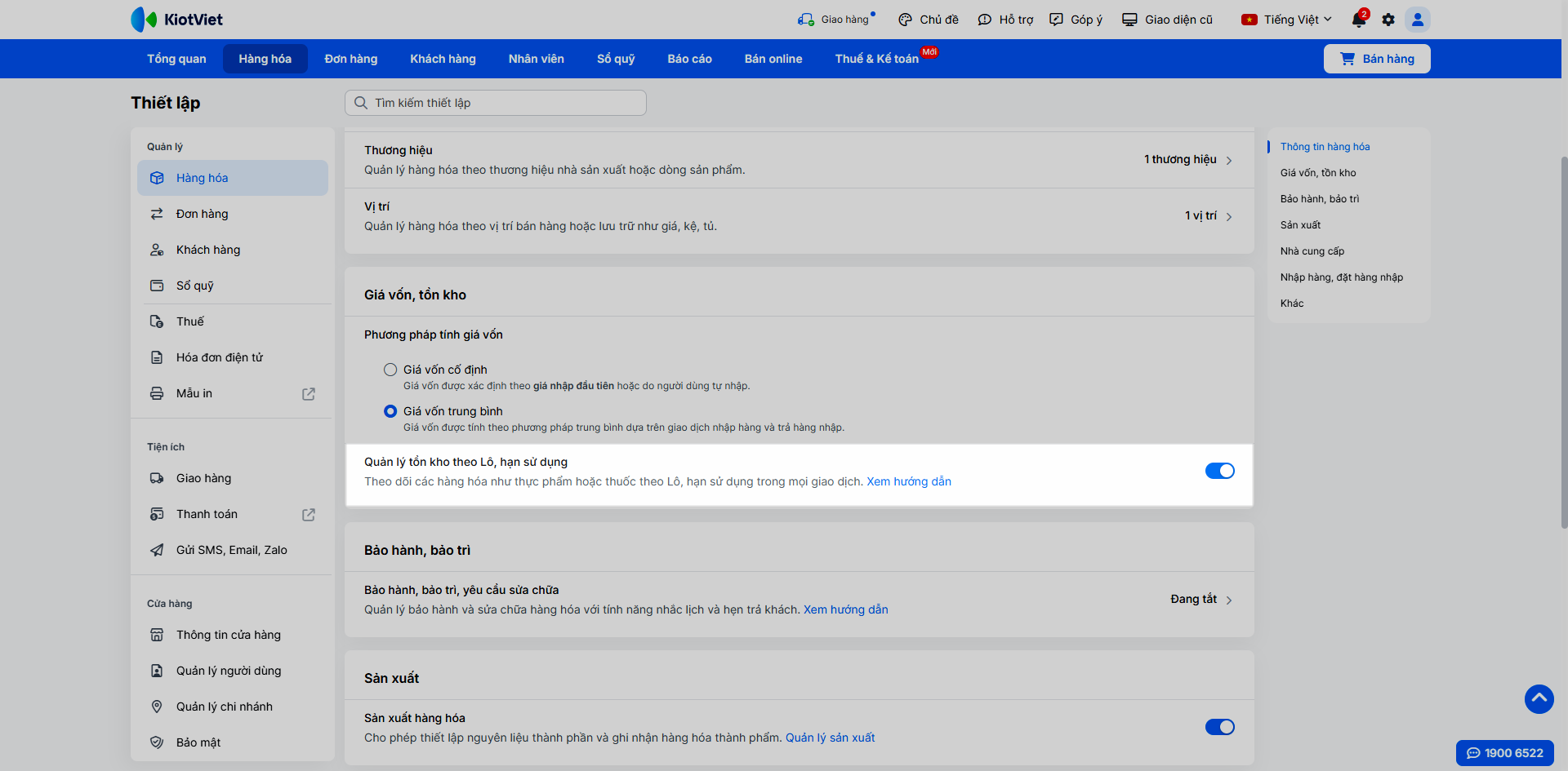 (1) Bật tính năng Lô – Hạn sử dụng: