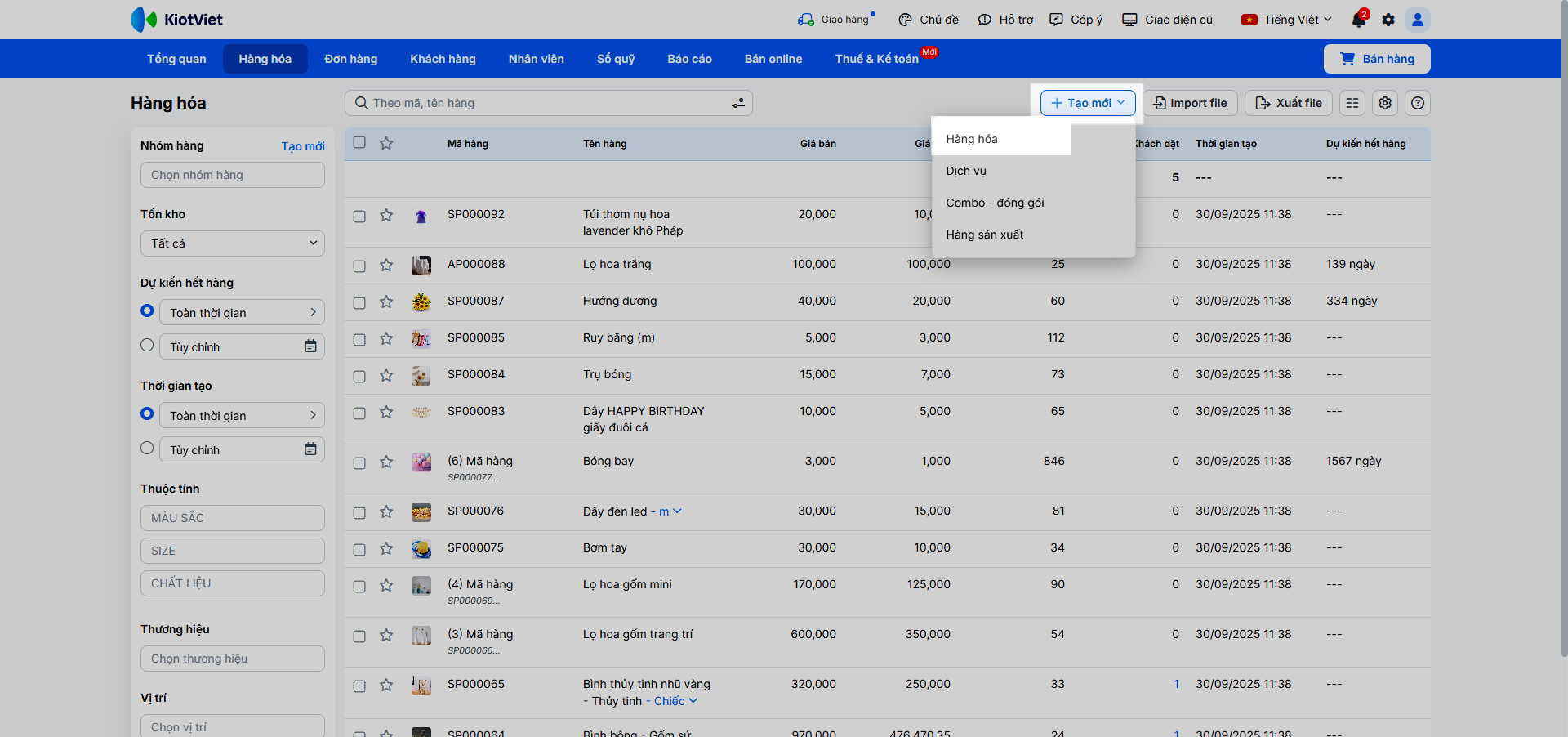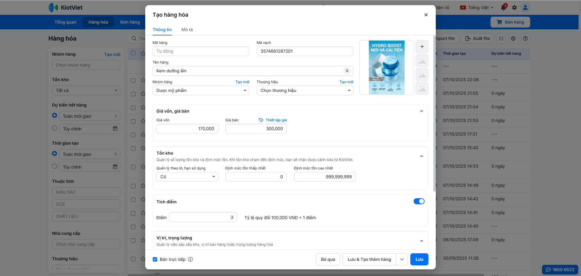 - Tình huống: Bạn cần tạo một sản phẩm mới như “Kem dưỡng ẩm” với nhiều phiên bản thể tích khác nhau và muốn quản lý sản phẩm này theo từng lô nhập hàng để kiểm soát chính xác.