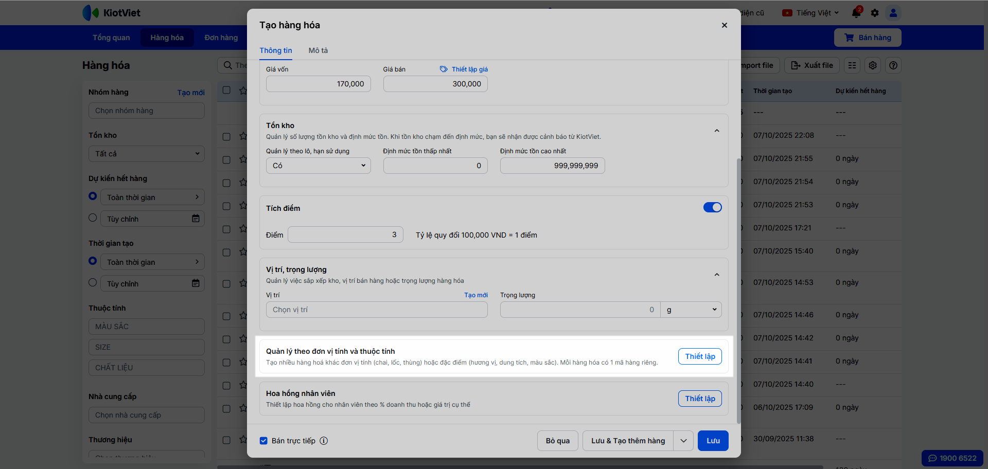 (3) Thêm thuộc tính: Tại mục Quản lý theo thuộc tính, đơn vị tính, nhấn Thiết lập.
