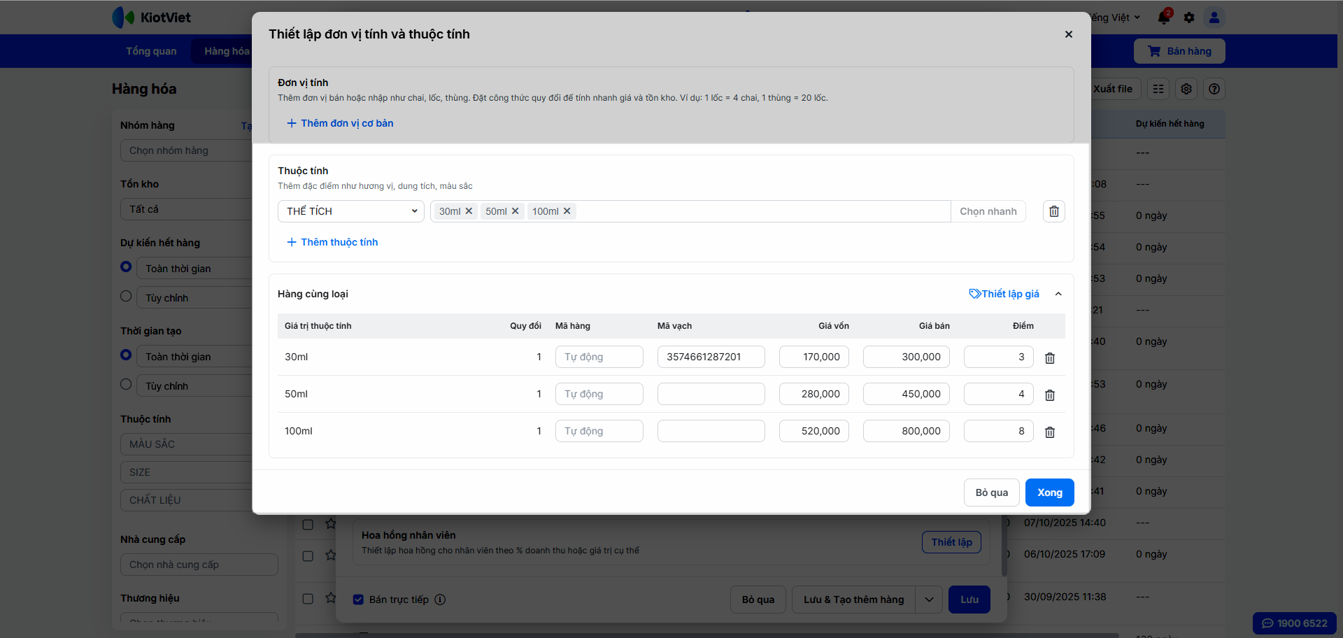 - Tại khu vực Thuộc tính: Tạo thuộc tính mới tên “Thể tích” và nhập các giá trị như “30ml”, “50ml”, “100ml”.