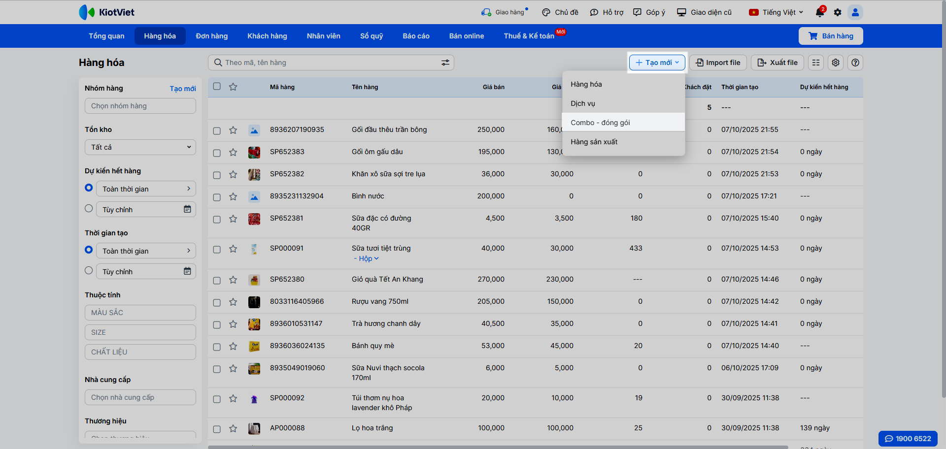 (1) Tại màn hình Hàng hóa → Danh sách hàng hóa, bạn nhấn Tạo mới → Combo – đóng gói.