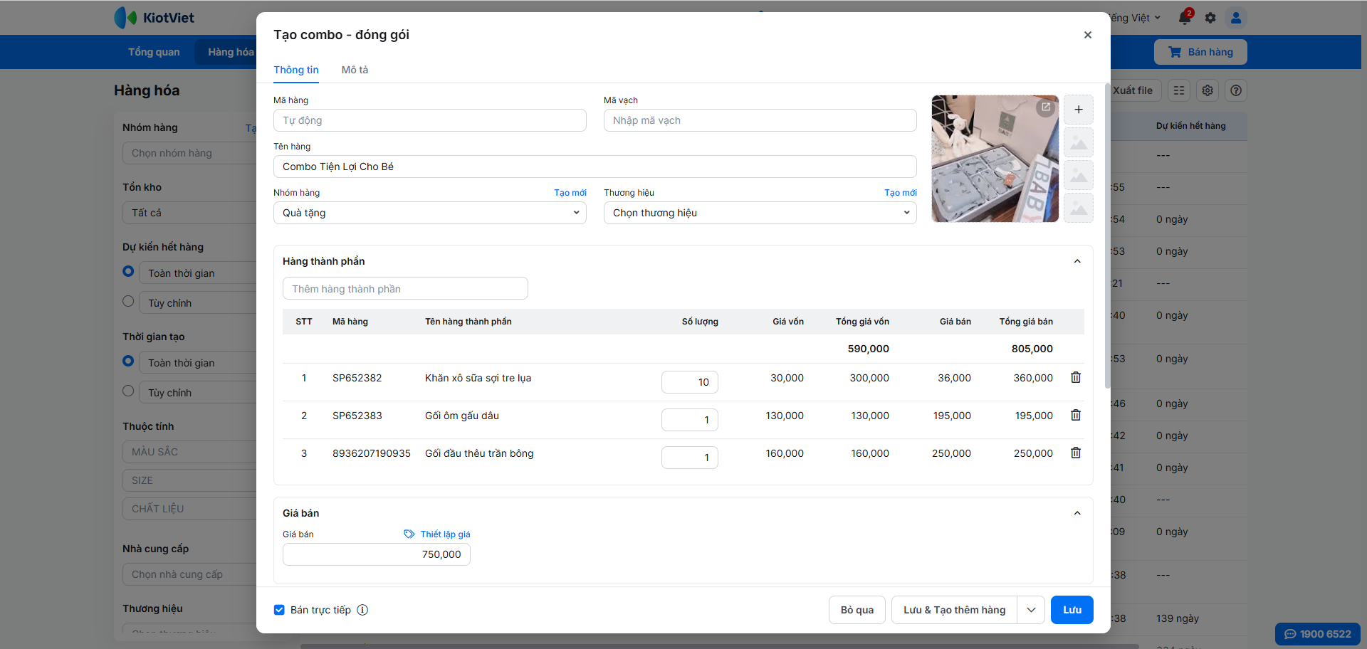 (4) Nhập Giá bán cho cả combo. Hệ thống sẽ tự động trừ tồn kho của từng sản phẩm thành phần khi bạn bán combo này.