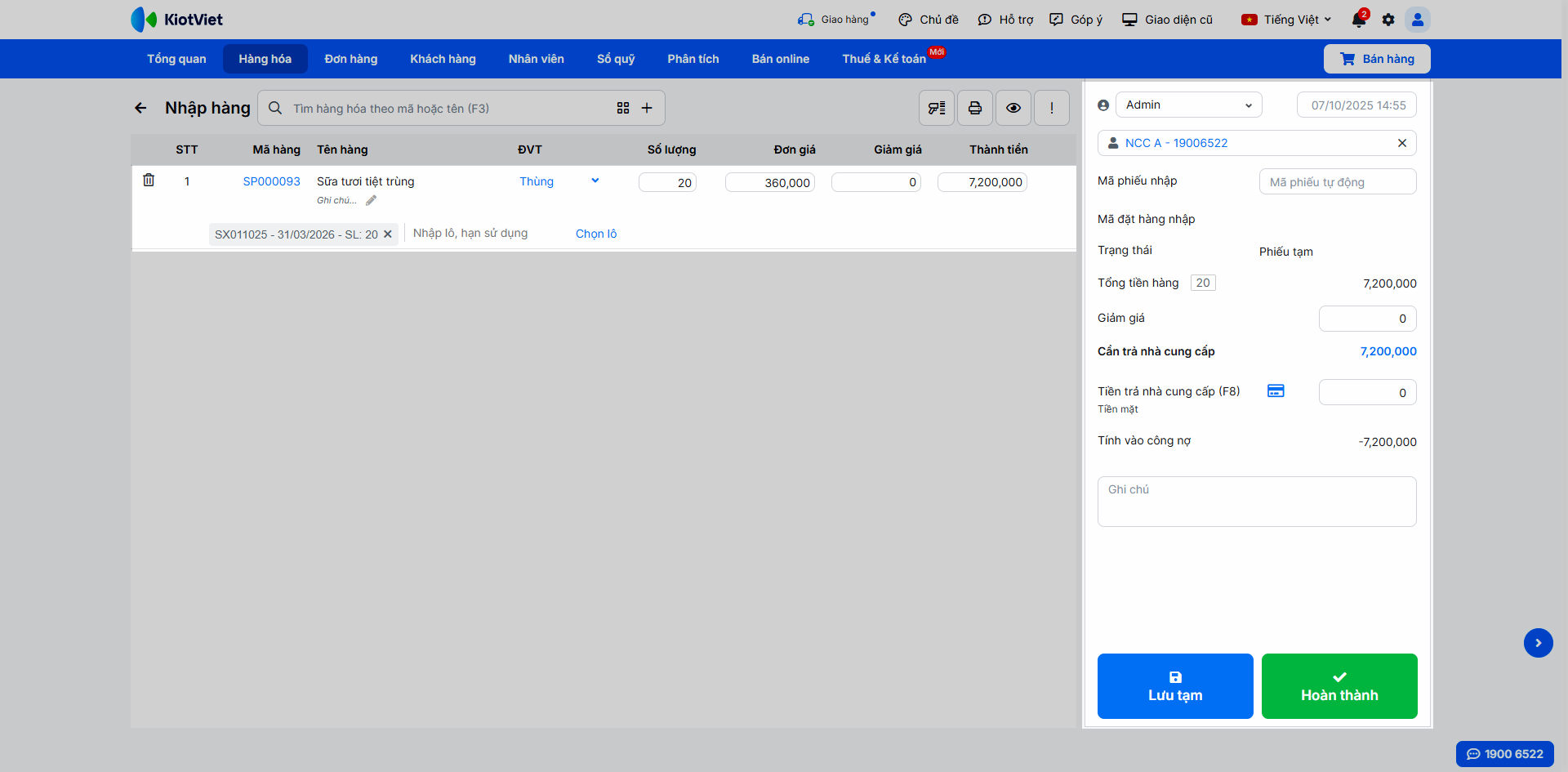 - Tình huống: Bạn vừa nhập một lô “Sữa tươi” mới và cần ghi nhận số lượng, hạn sử dụng và giá vốn của lô đó vào hệ thống.