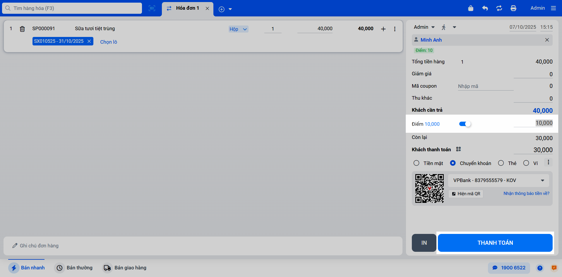 (3) Sử dụng điểm tích lũy: Tại thông tin thanh toán bên phải màn hình, hệ thống sẽ hiển thị số điểm khách có và giá trị quy đổi. Bạn bật xanh Điểm → nhập số tiền muốn quy đổi (không vượt quá tổng tiền khách phải trả)