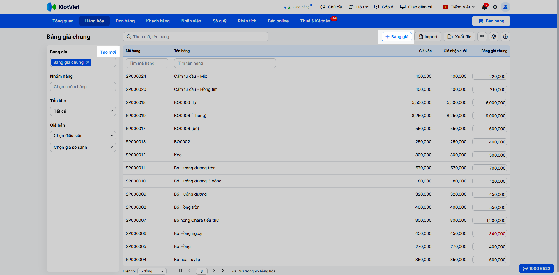 (1) Vào menu Hàng hóa → Thiết lập giá.