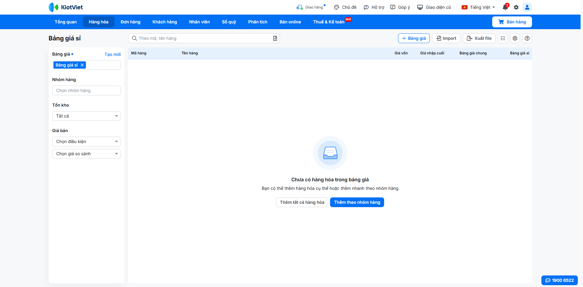 (4) Sau khi Lưu, hệ thống sẽ chuyển sang màn hình để bạn nhập giá sỉ cho từng hàng hóa cụ thể hoặc thêm nhanh theo nhóm hàng.