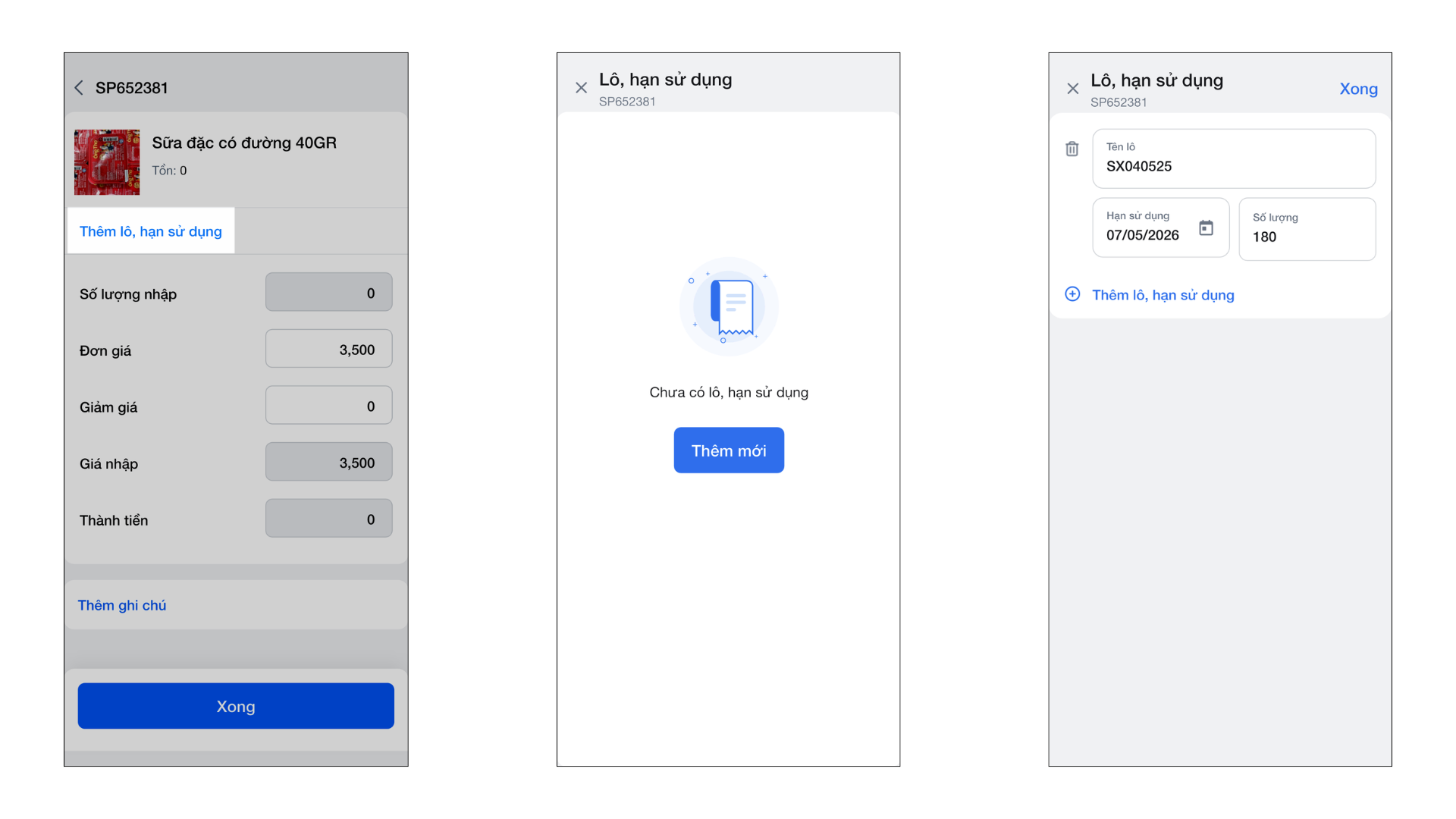 (2) Khi tạo phiếu Nhập hàng, sau khi chọn sản phẩm, ứng dụng sẽ cho phép bạn nhập thông tin chi tiết về lô hàng (nếu có).