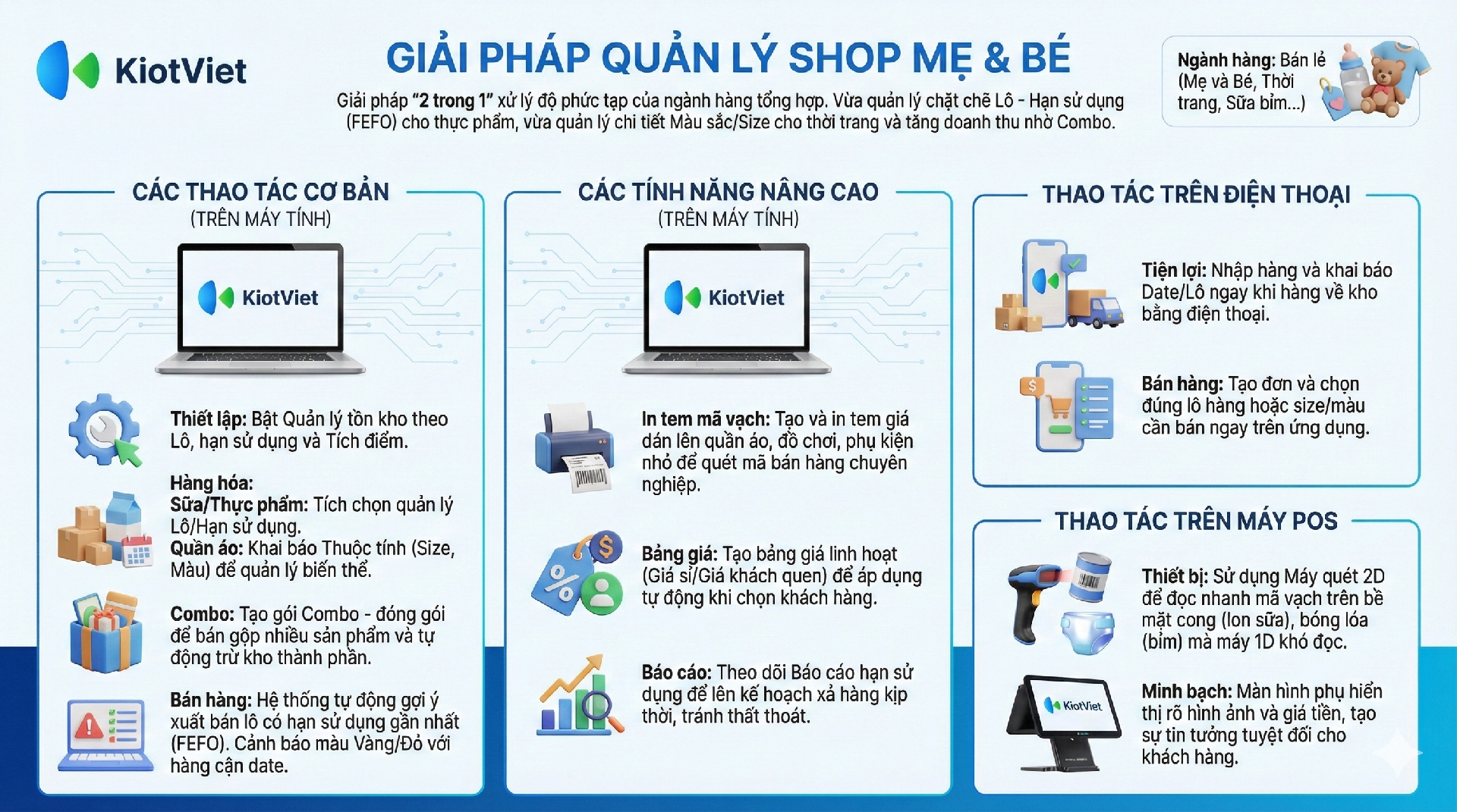 Để đáp ứng những yêu cầu đặc thù của ngành Mẹ và Bé, KiotViet đã phát triển một bộ tính năng chuyên ngành, được thiết kế riêng để giúp các cửa hàng vận hành hiệu quả, chuyên nghiệp và tối ưu hóa việc quản lý sản phẩm. Bộ tính năng này không chỉ là một công cụ quản lý bán hàng thông thường mà còn là một giải pháp toàn diện, tập trung vào việc quản lý các mặt hàng đa dạng (sữa, bỉm, quần áo, đồ chơi) theo thuộc tính (size, màu), kiểm soát chặt chẽ sản phẩm có giá trị cao theo Lô – Hạn sử dụng, tạo các gói hàng (combo) hấp dẫn và quản lý chương trình khách hàng thân thiết (tích điểm). Tất cả đều nhằm mục đích giúp chủ cửa hàng kiểm soát chặt chẽ hàng tồn kho, giảm thiểu rủi ro, tăng cường sự gắn kết của khách hàng và nâng cao chất lượng phục vụ.