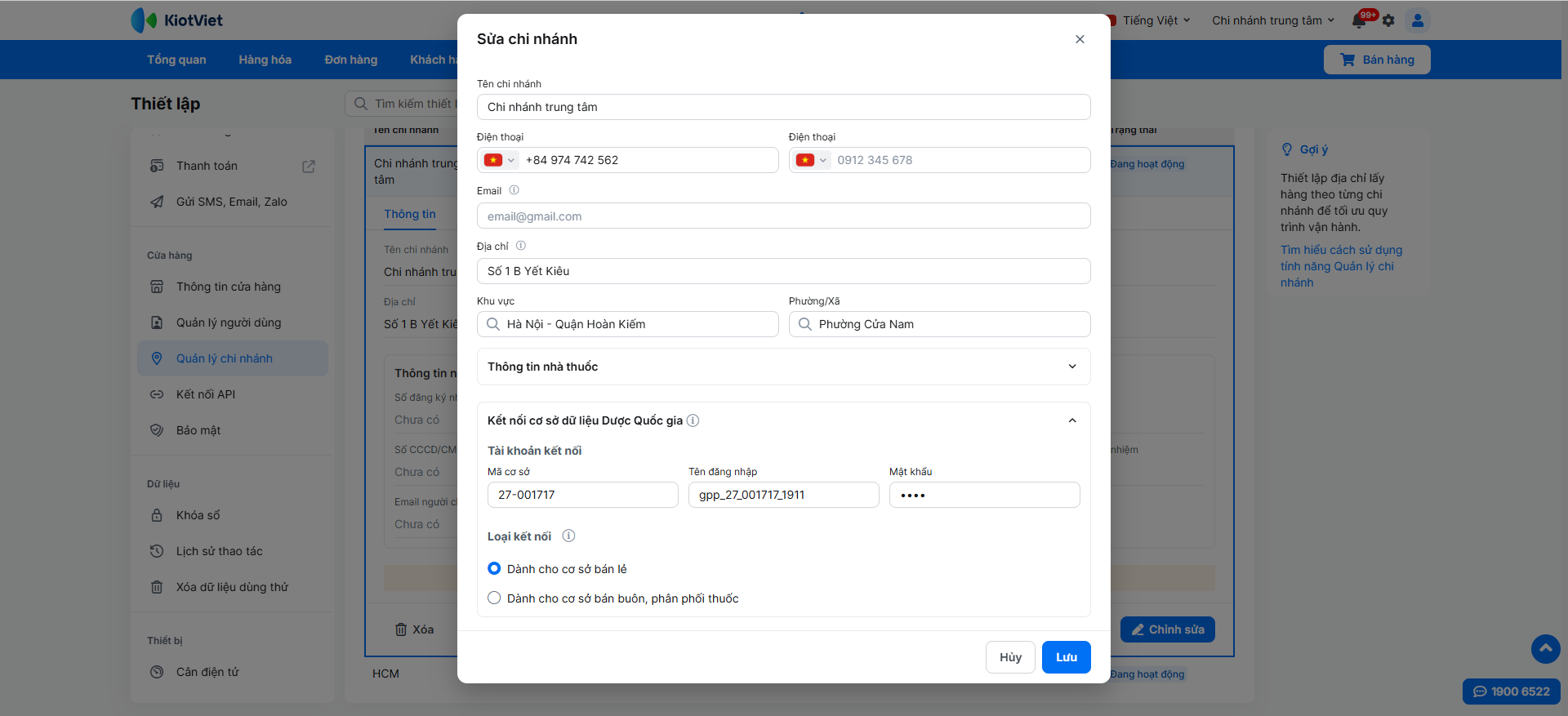 - Tình huống: Để bắt đầu liên thông dữ liệu, bạn cần thiết lập kết nối giữa chi nhánh nhà thuốc trên KiotViet với tài khoản trên CSDL Dược Quốc gia.