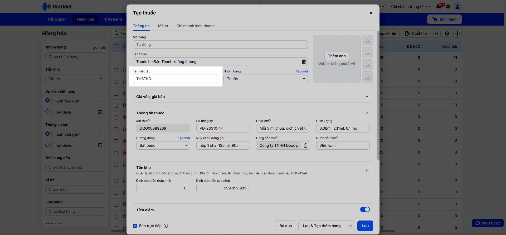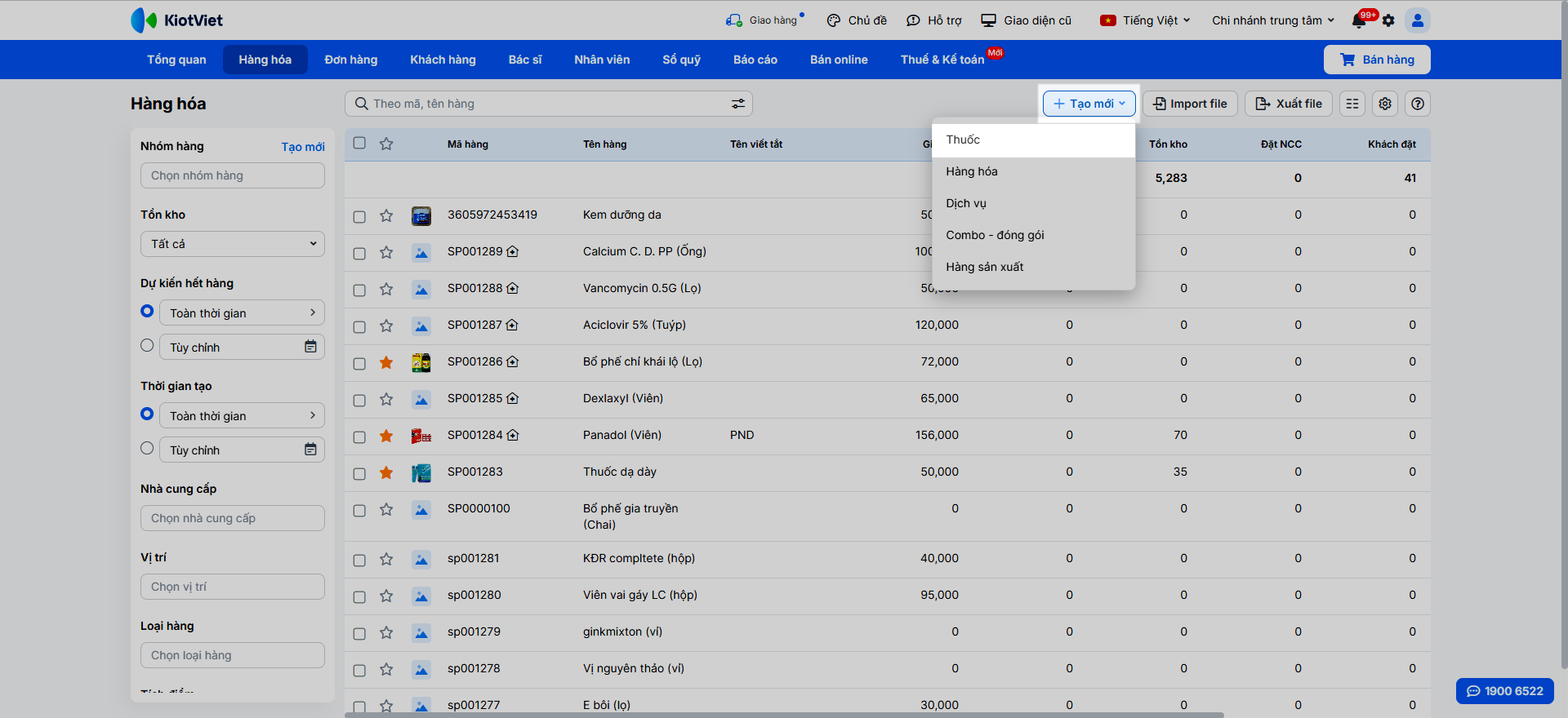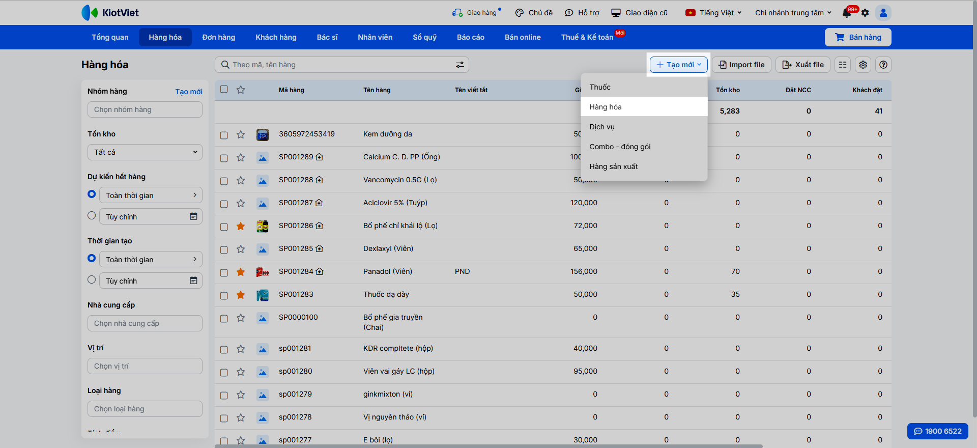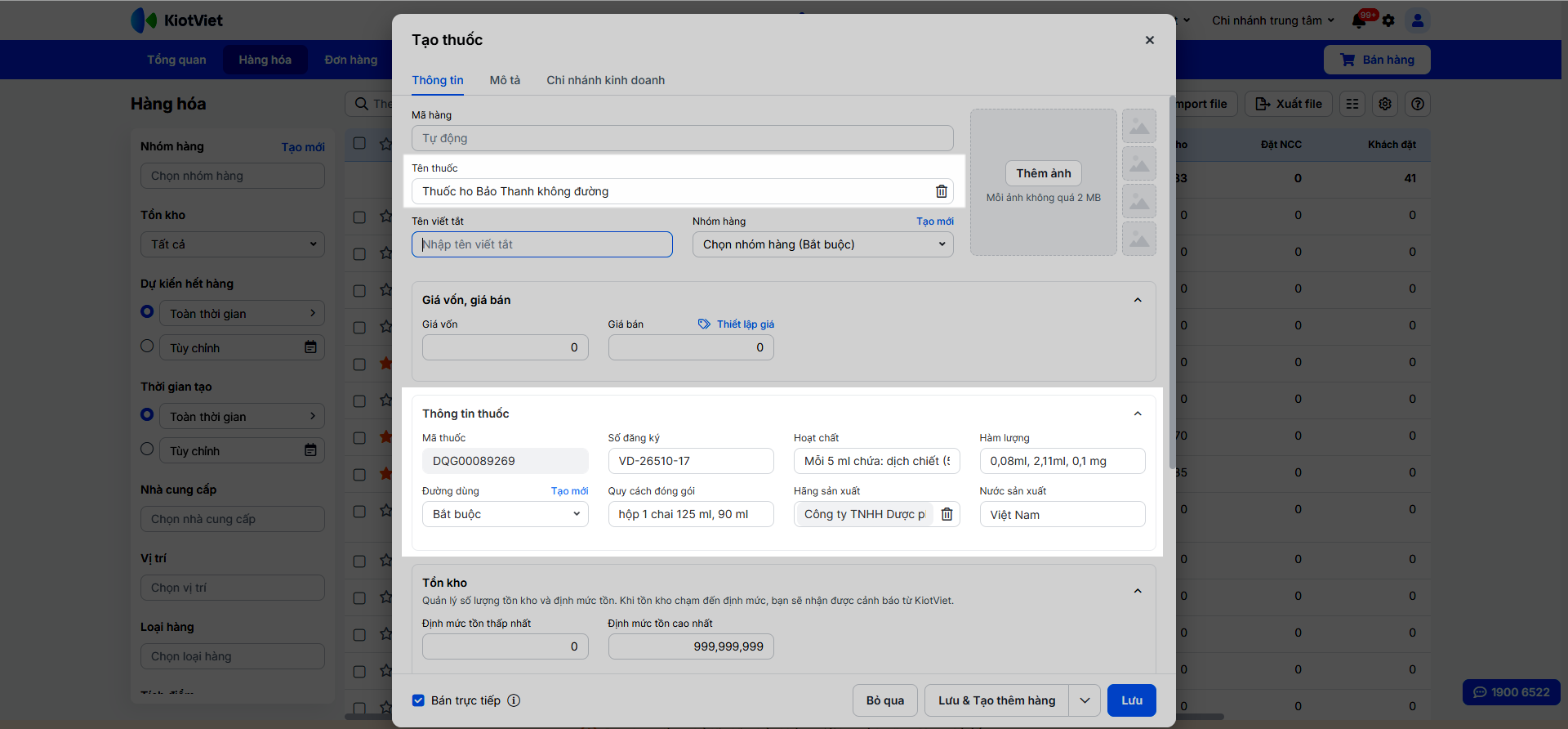 - Hàng hóa loại Thuốc sẽ mặc định được quản lý theo Lô – Hạn sử dụng.