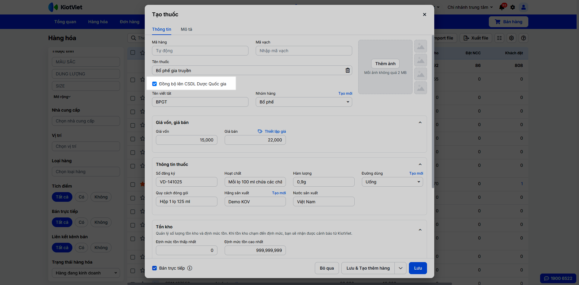 - Tích chọn Đồng bộ lên CSDL Dược Quốc gia nếu bạn muốn hệ thống đồng bộ thông tin, giao dịch gắn với hàng hóa đó lên CSDLDQG.