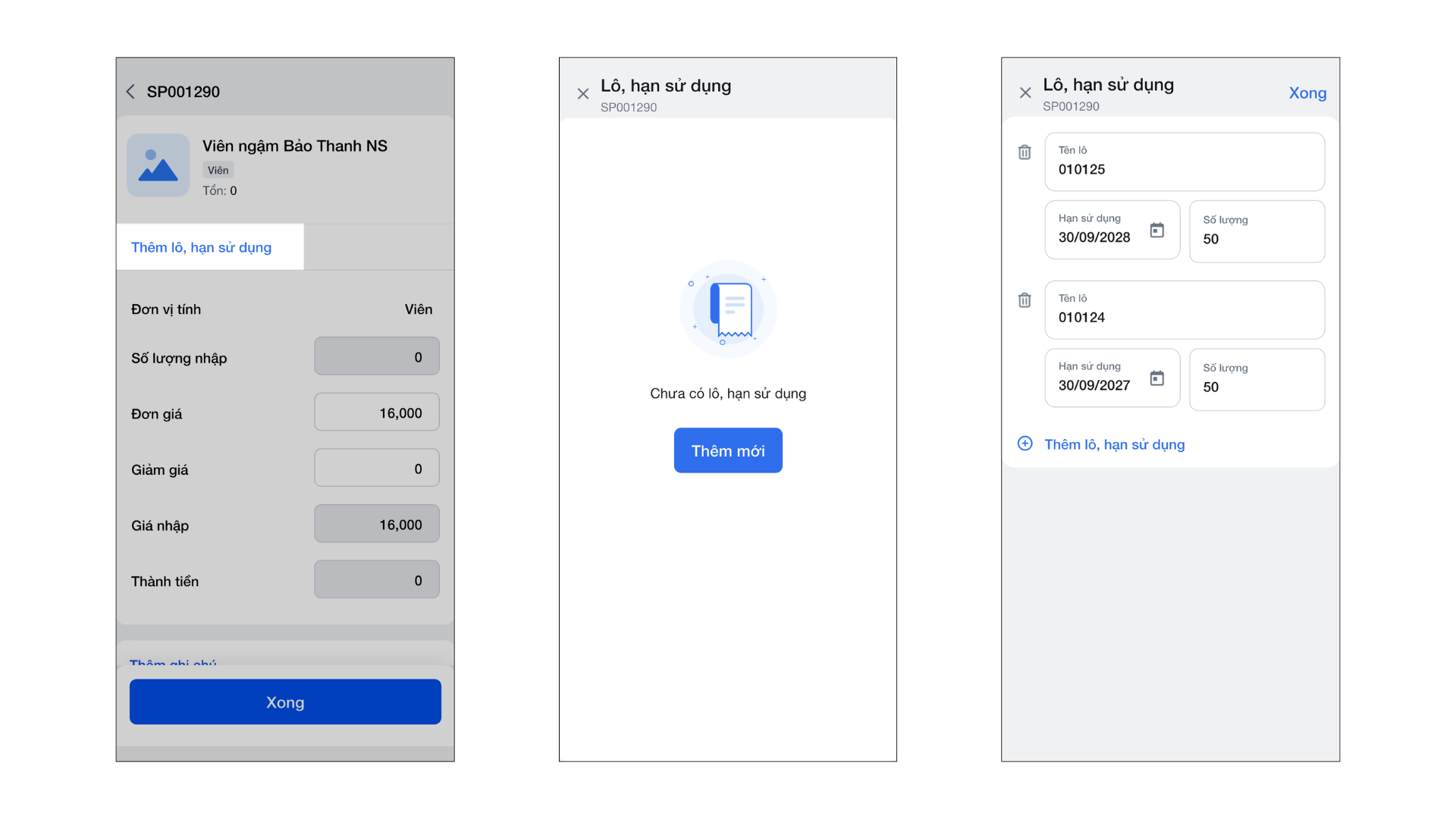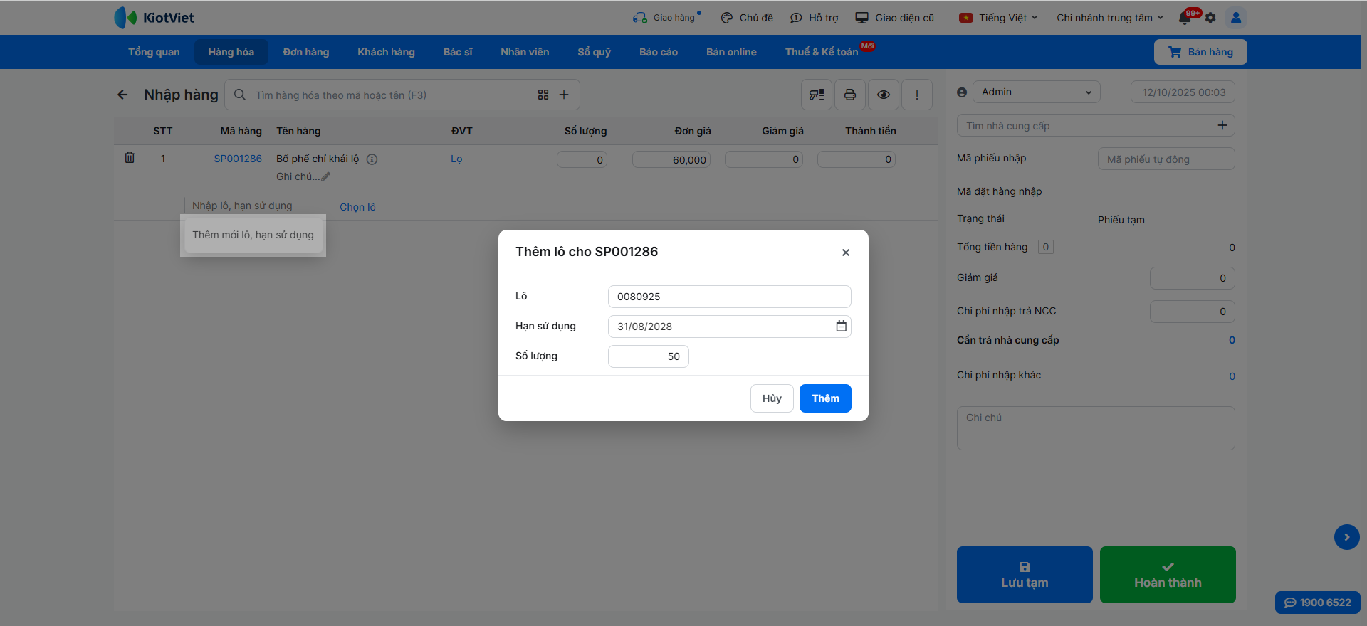 - Nhập Lô, Hạn sử dụng, Số lượng → nhấn Thêm