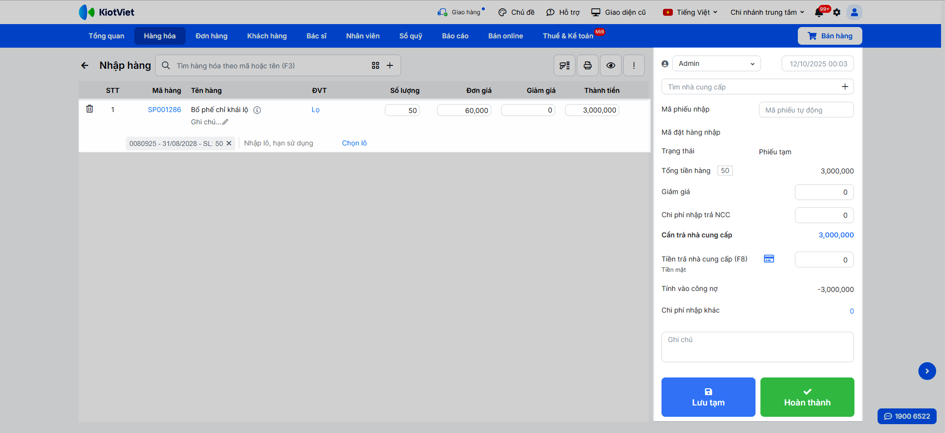- Nhấn Hoàn thành phiếu nhập để tăng tồn kho cho lô hàng vừa nhập.