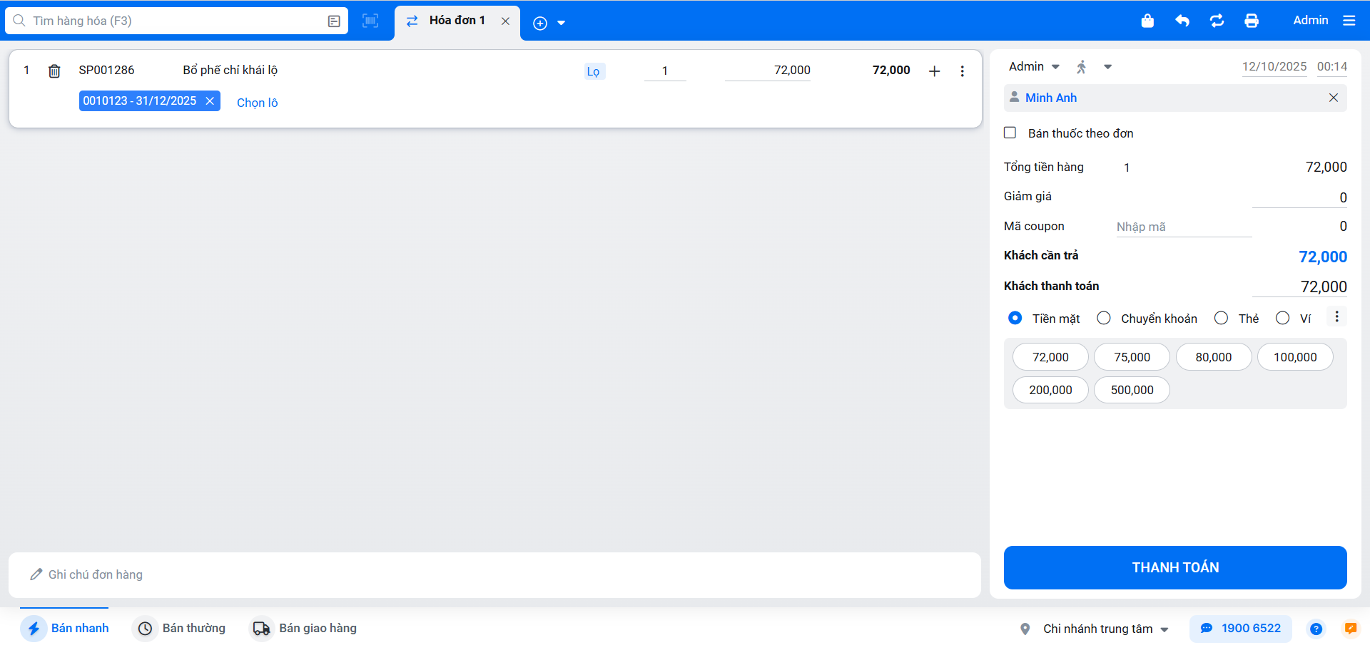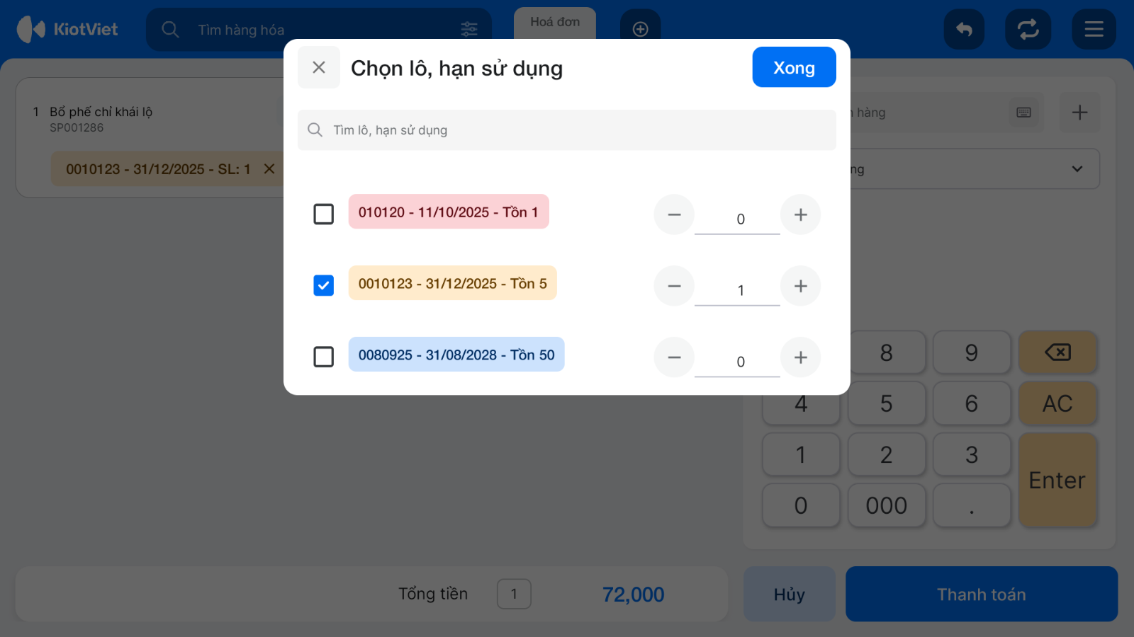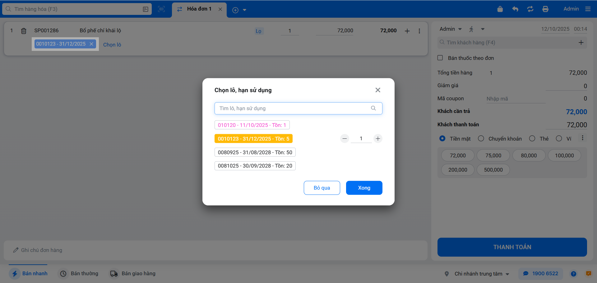- Hệ thống tự động gợi ý theo lô có hạn sử dụng gần nhất. Bạn có thể chọn một lô khác từ danh sách.