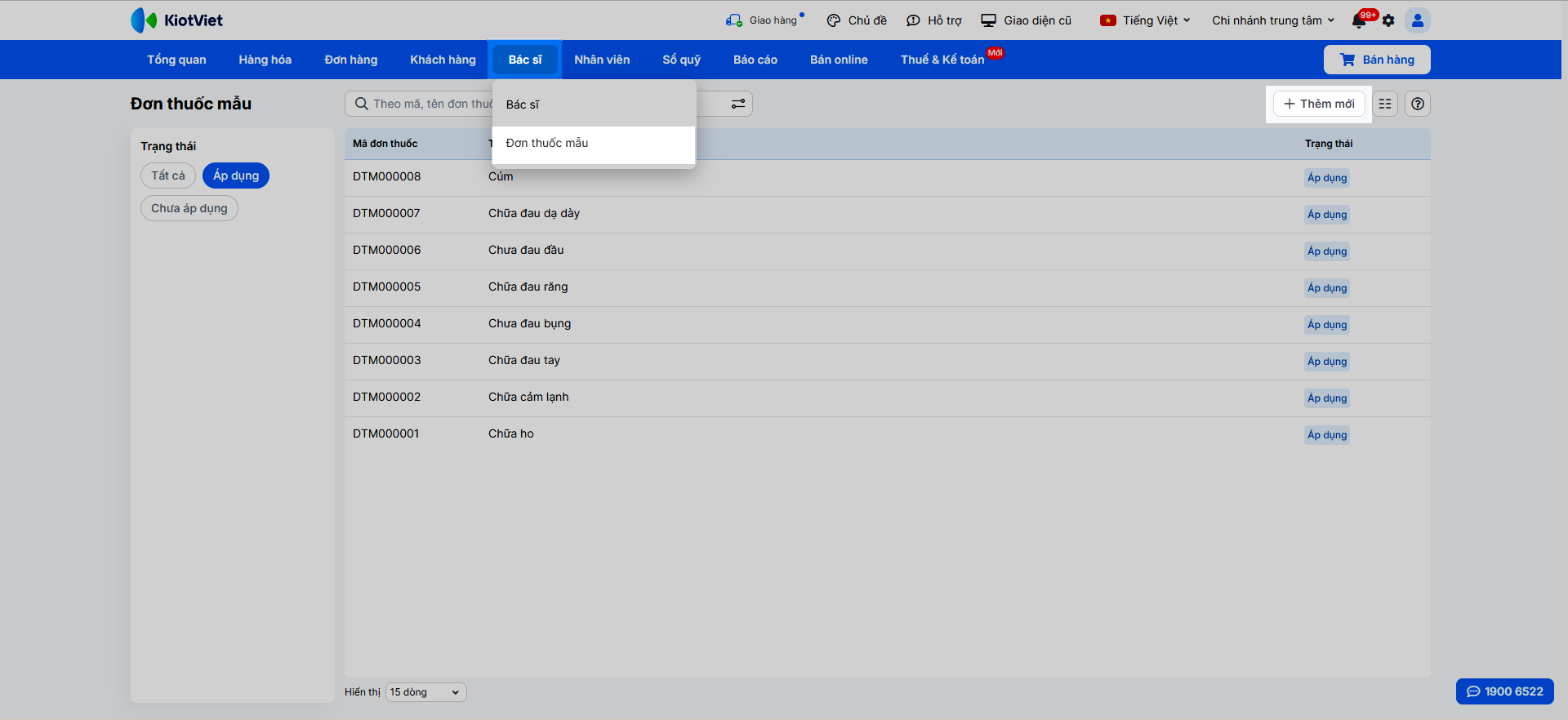 - Bạn vào Bác sĩ → Đơn thuốc mẫu và nhấn Thêm mới.