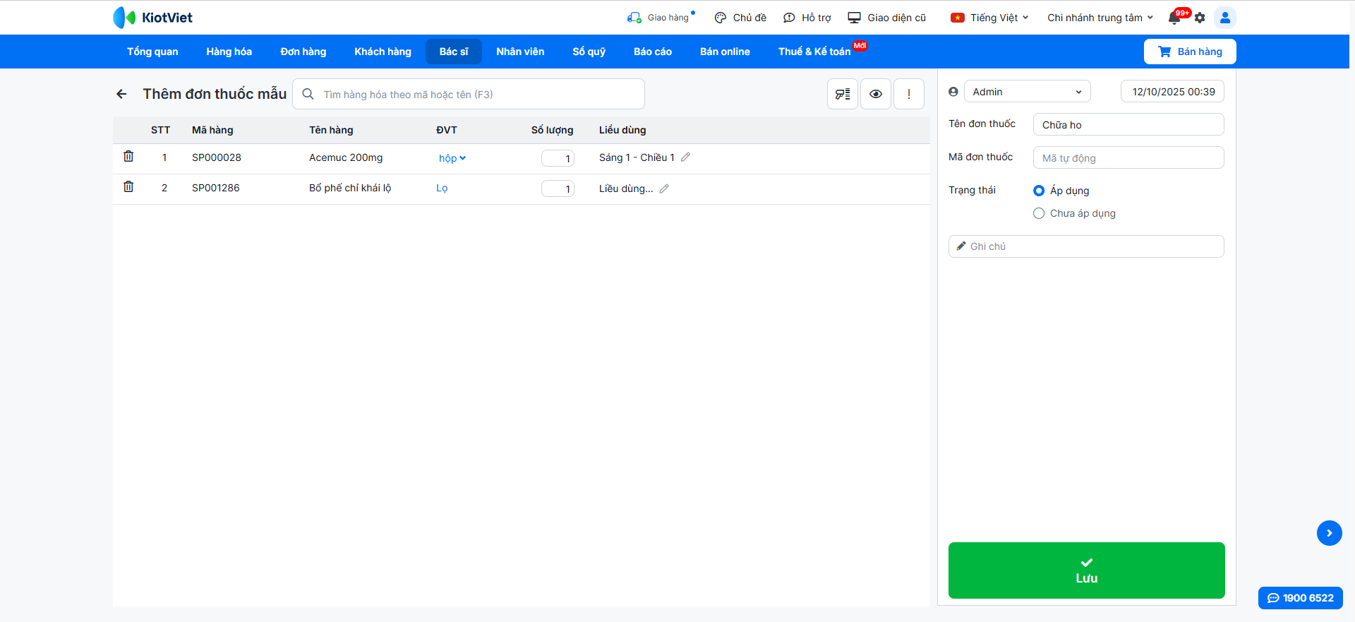 - Hiển thị thông tin hàng hóa trên KiotViet với ghi chú cách dùng và số lượng theo đơn bác sĩ kê.